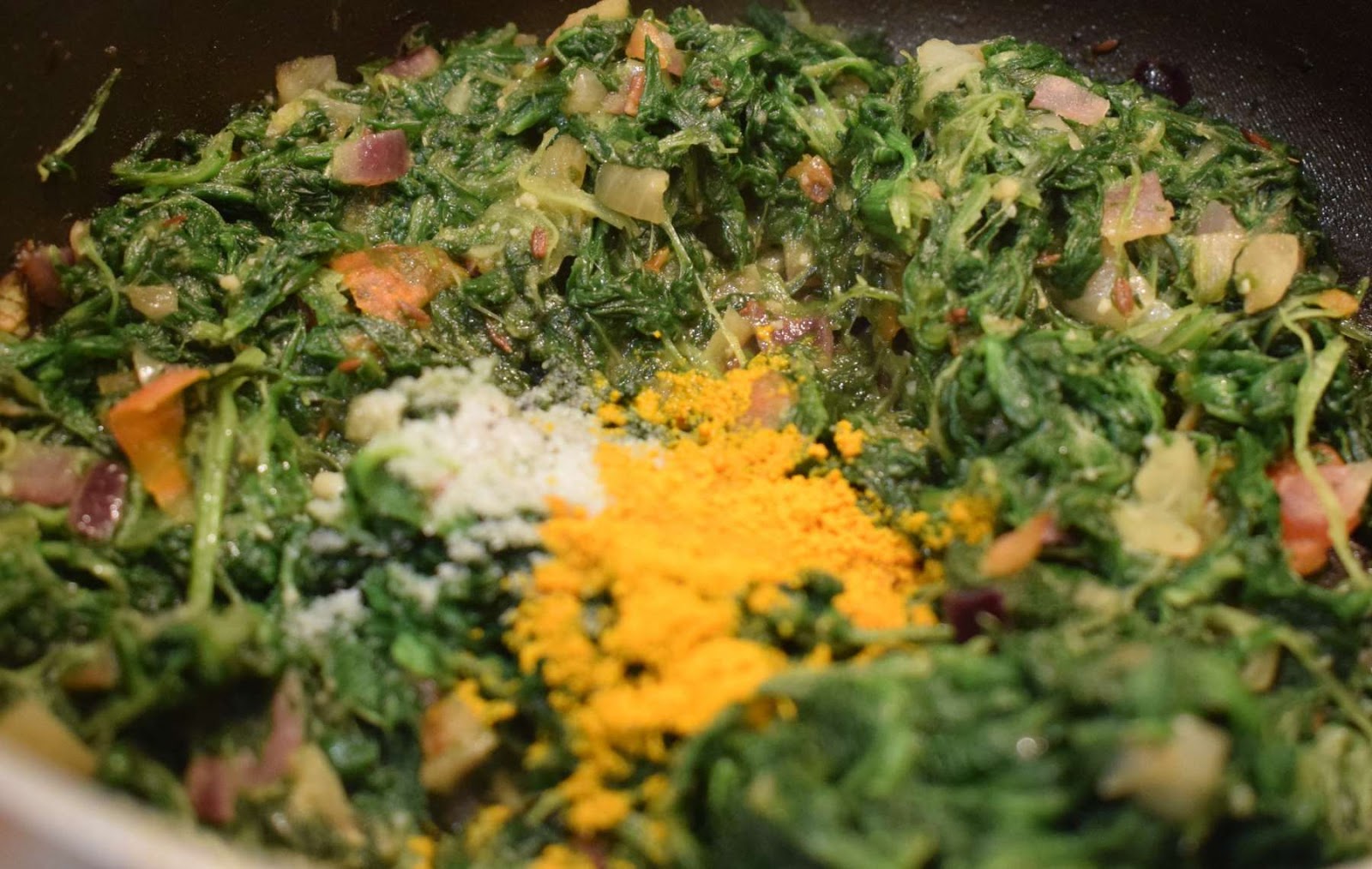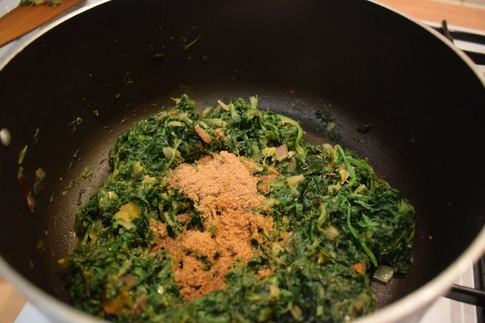 After tempering the whole spice, I have fried Onions, Ginger-Garlic paste, Tomatoes and have then added chopped Spinach to get cooked. Then I have added the ground spices and cooked them for some time.