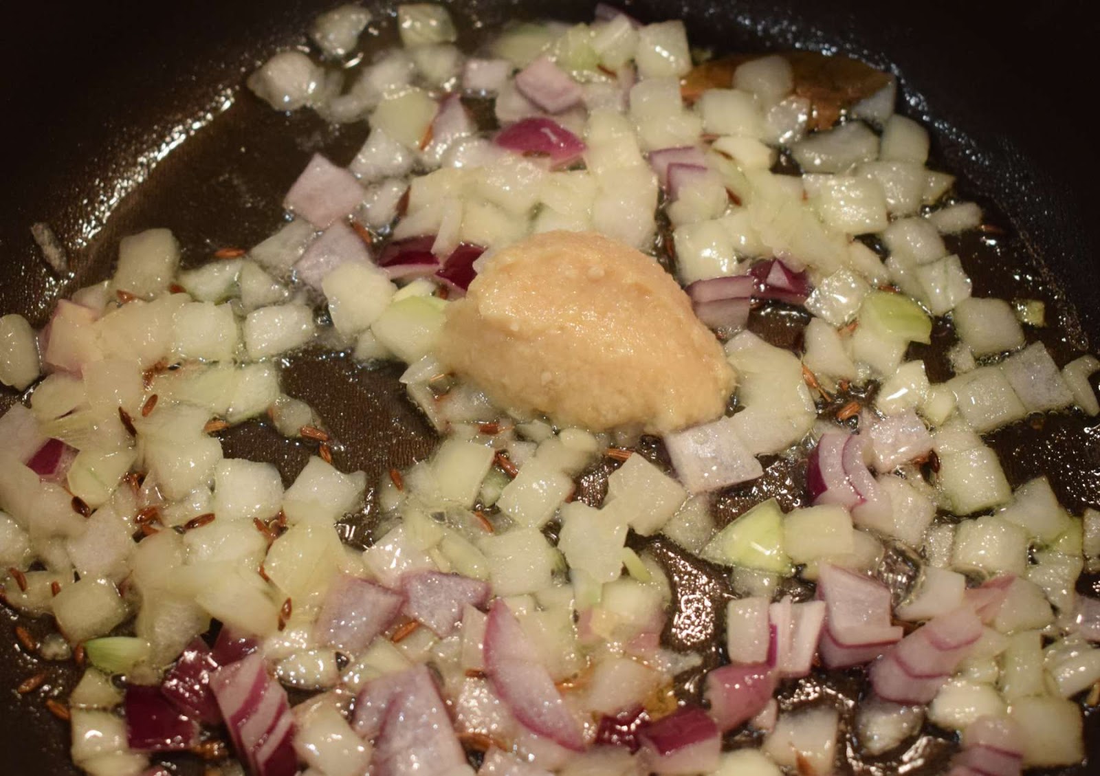 - Add Ginger-Garlic paste into the pan and cook it for another minute till the raw smell goes away.