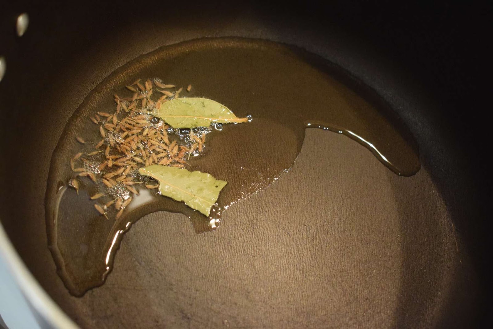 - Once the oil is hot, add Cumin seeds, Bay leaves and let them crackle.