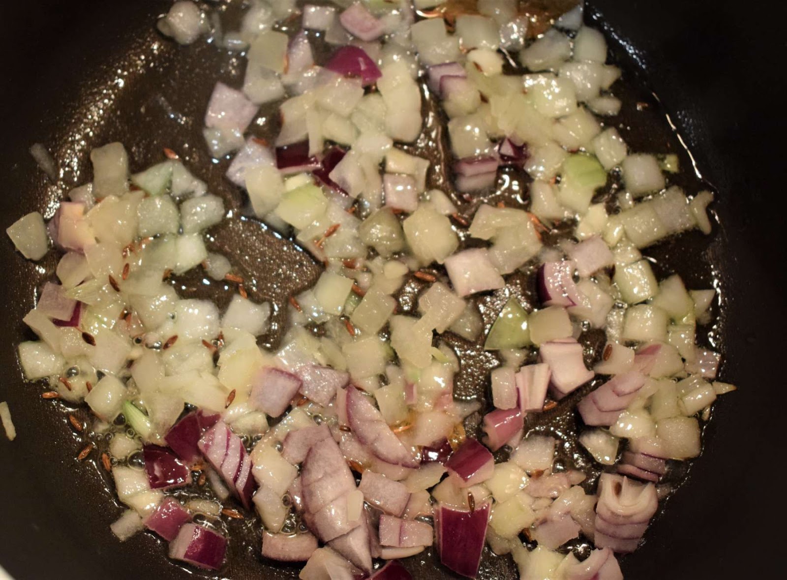 - Add the diced Onions and cook it for 2 minutes in medium high flame until it becomes translucent.