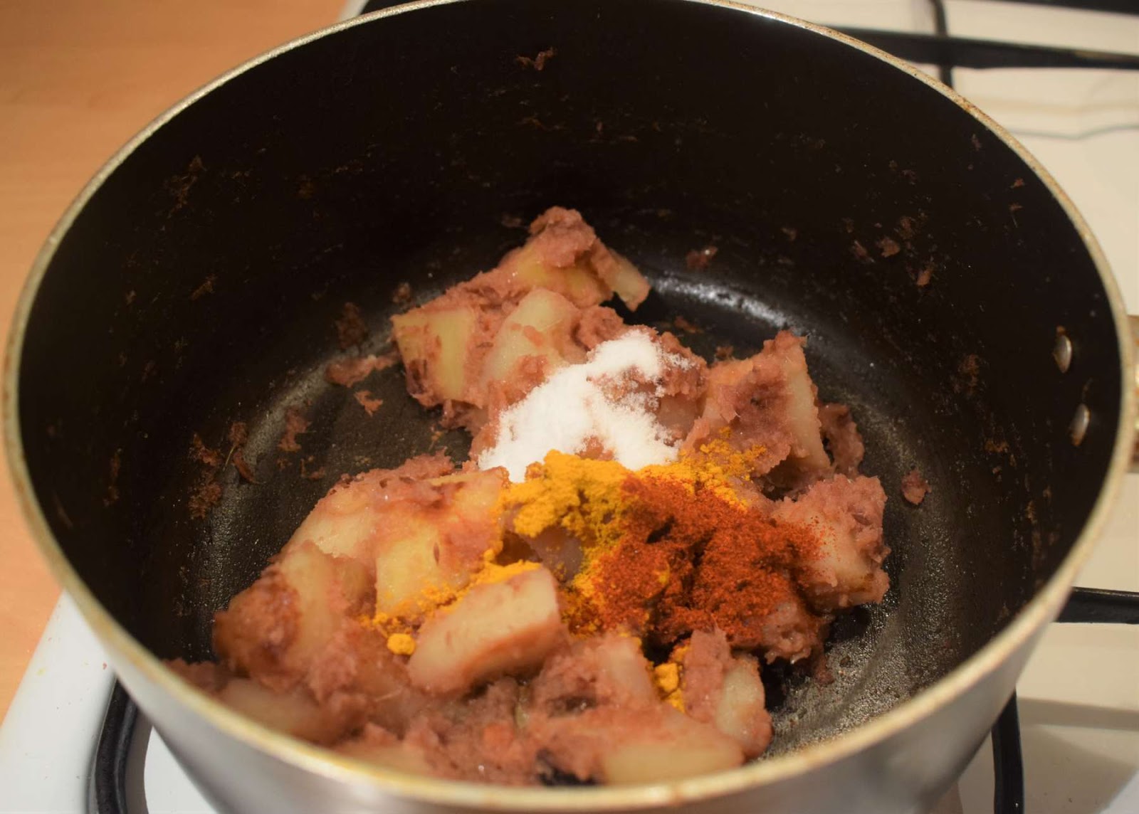 - Add Turmeric powder, Chilli powder, Salt and give a nice mix.