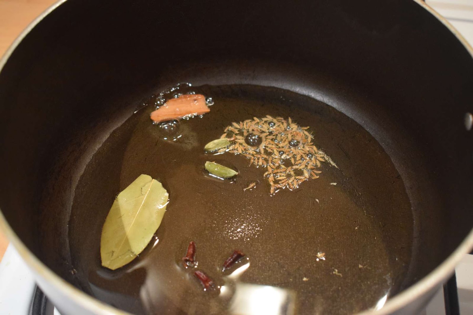 - Once the Oil is hot put the flame in medium and add Cumin seeds, Cinnamon stick, Cardamoms, Bay leaves and Cloves and let them crackle.