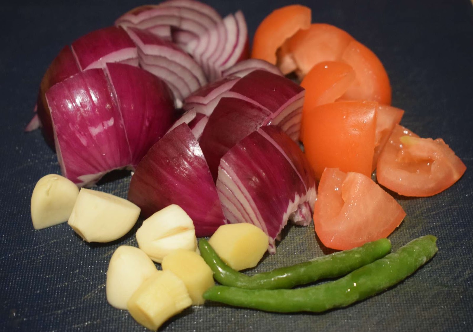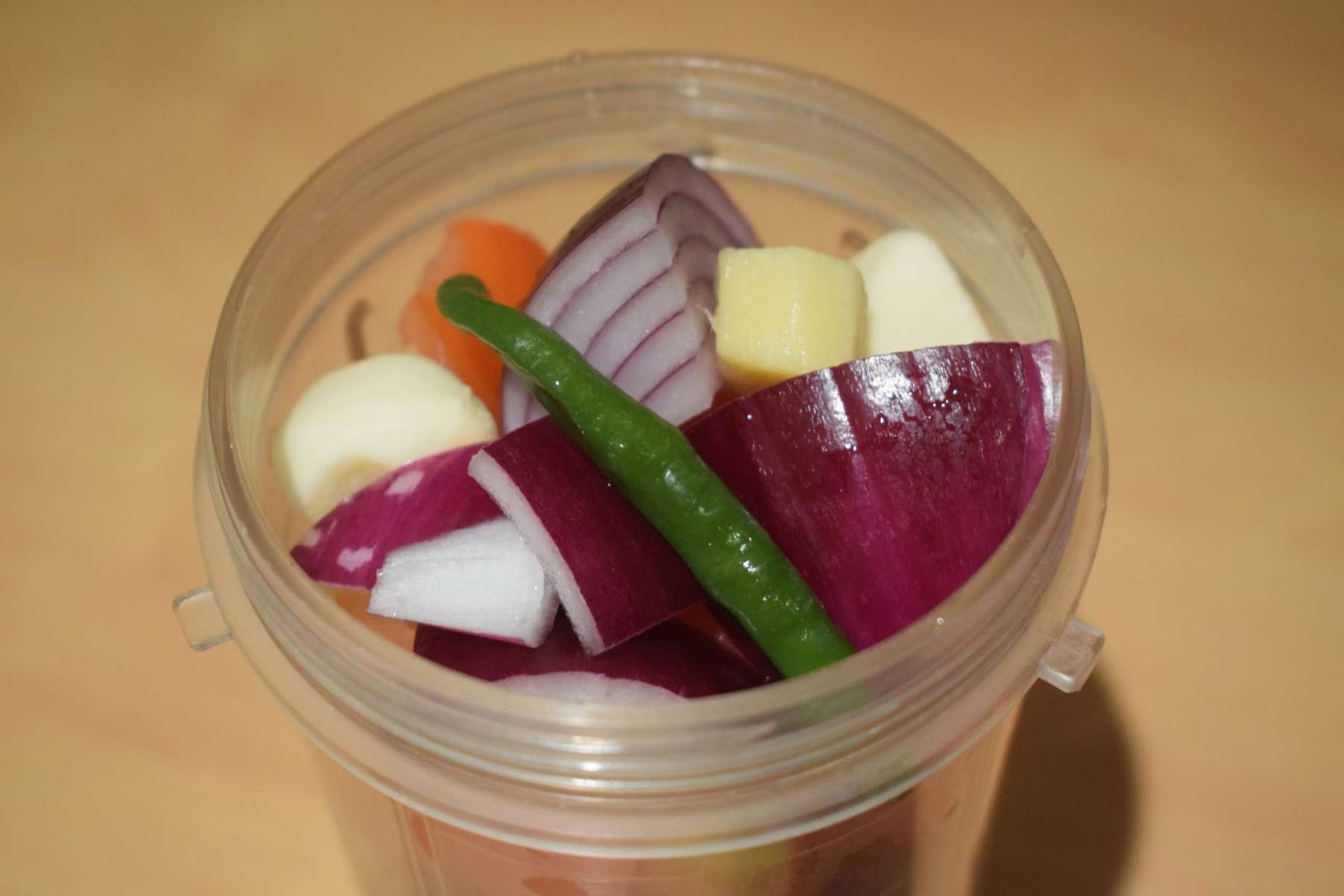 - Transfer the diced Onions, Tomatoes, Ginger, Garlic cloves and green Chillies into the jar of a grinder or blender.