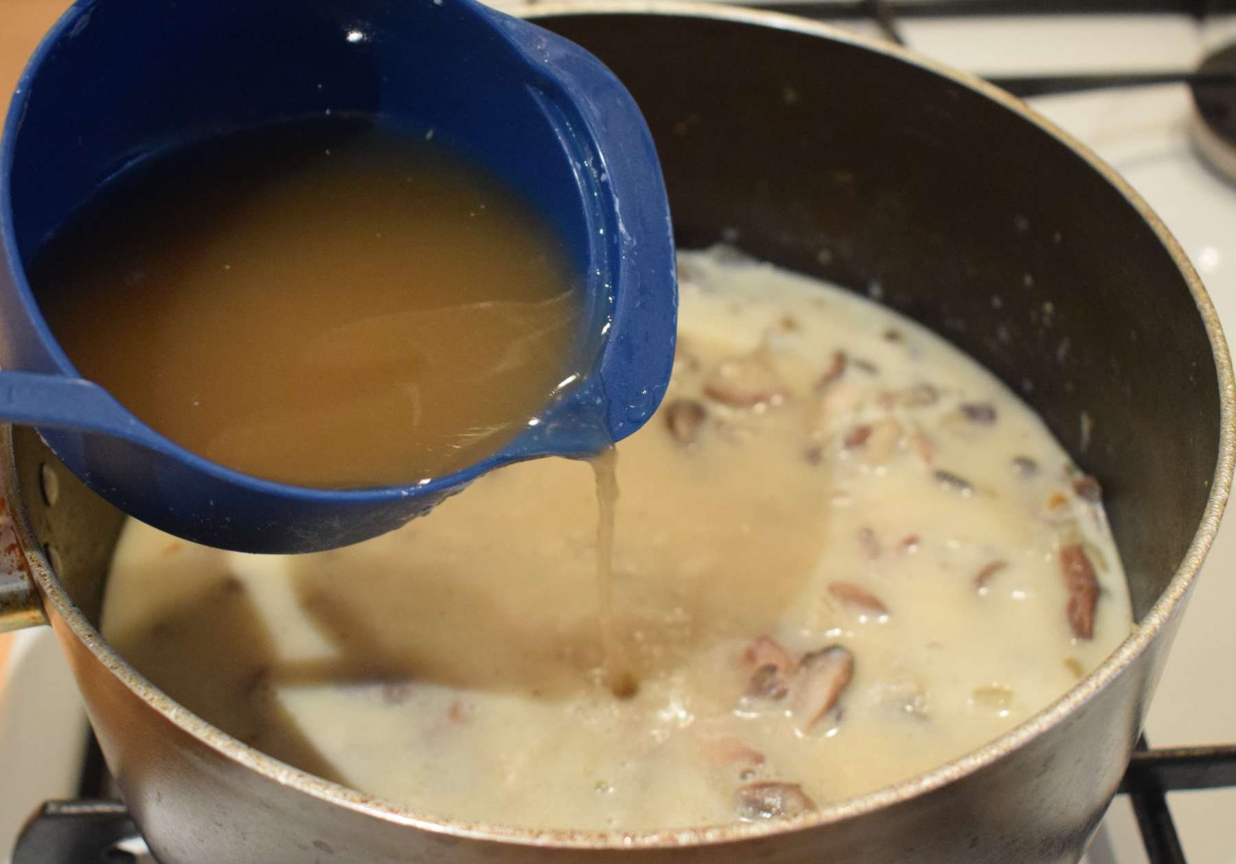 - Add chicken stock or vegetable stock into the pan and give a nice stir.