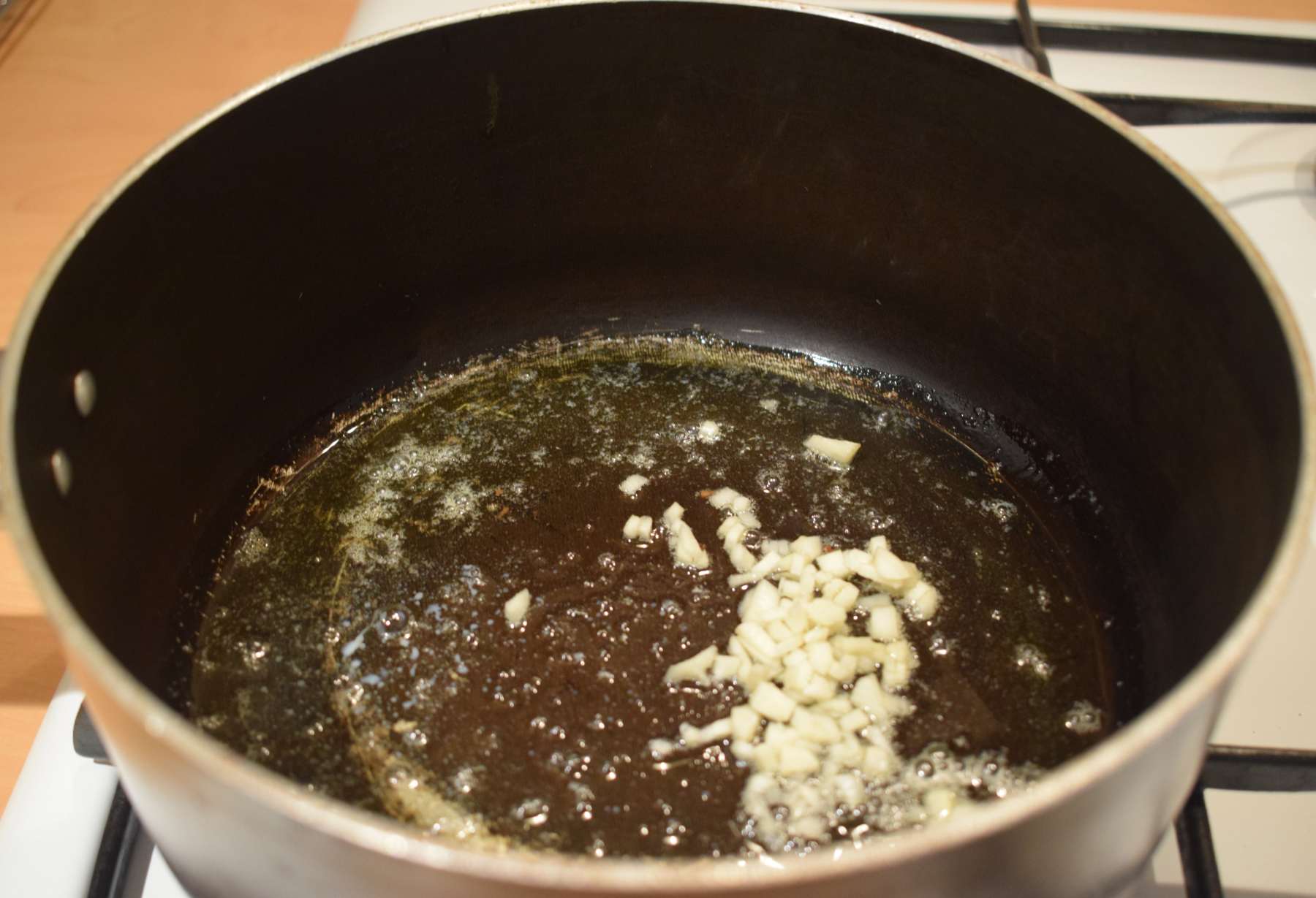- Add chopped garlic into the pan and cook it for a minute in medium flame until the raw smell disappears.