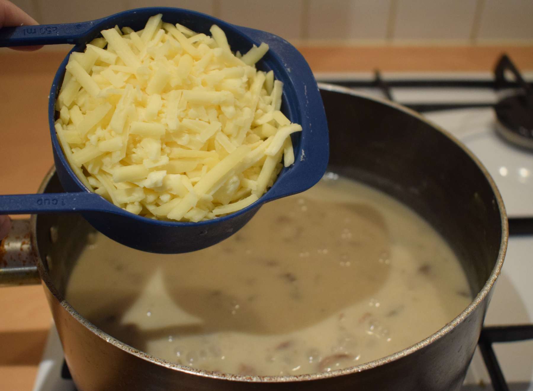 - Put the flame in low and add cheddar cheese into the pan. Stir it nicely until the cheese melts.