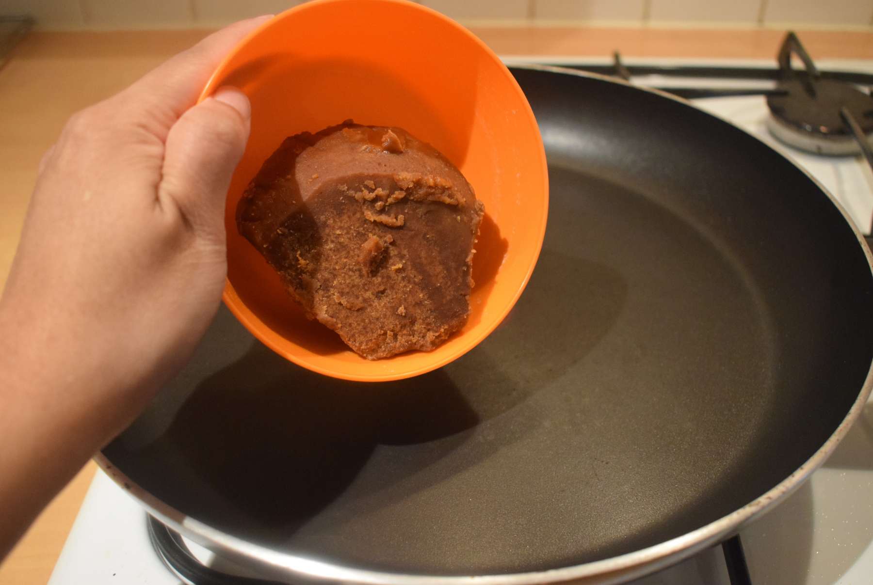 - Add 150 grams nolen gur or date palm jaggery into the pan.