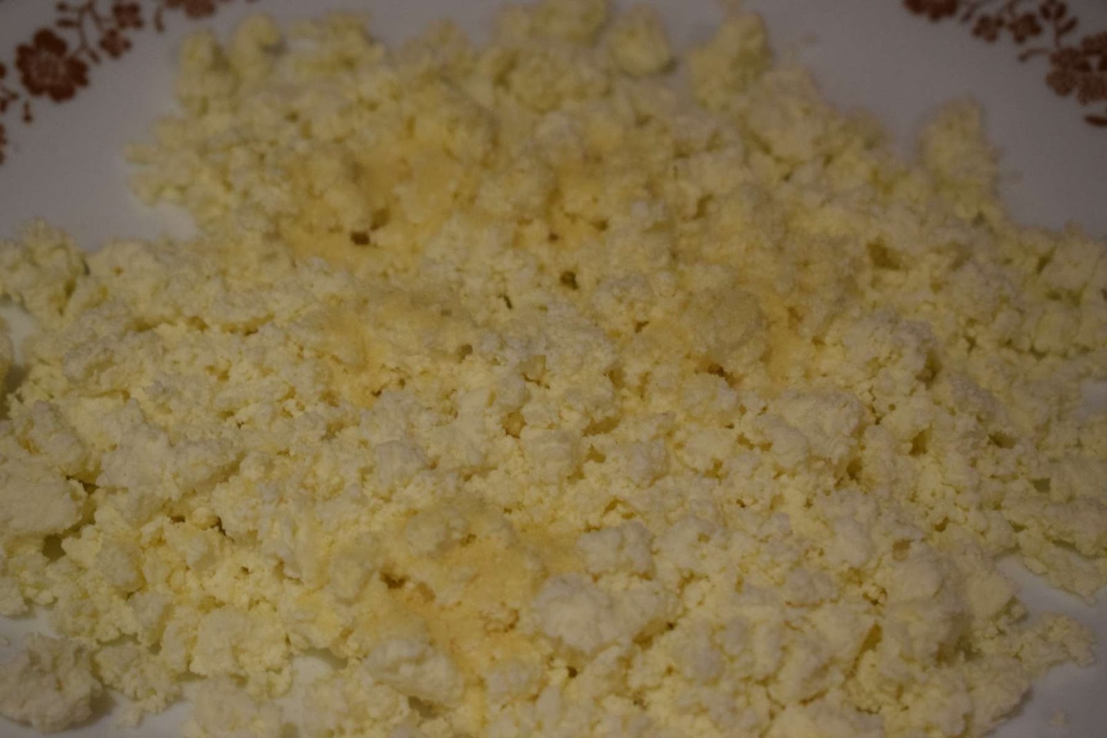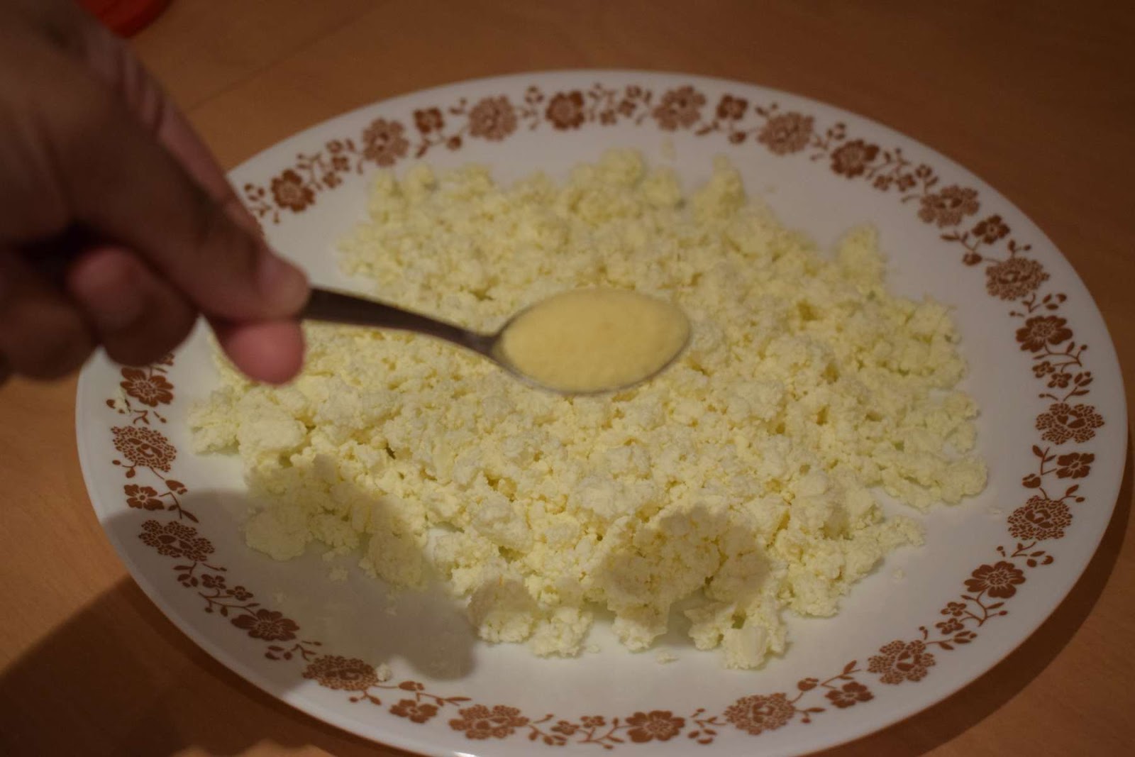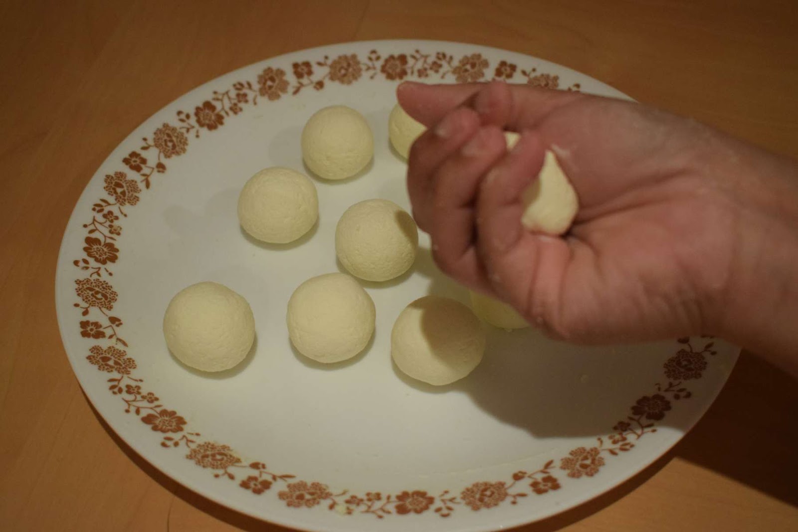 - Take one small portion at a time in your hand and fist your hand repetitively by rotating the Chenna portion.