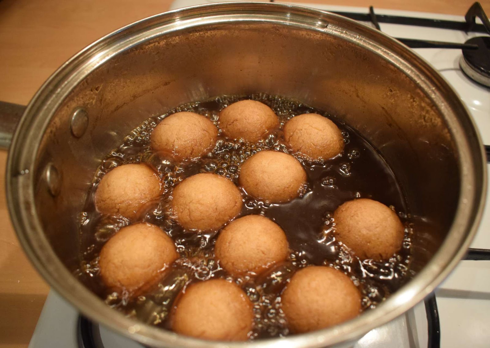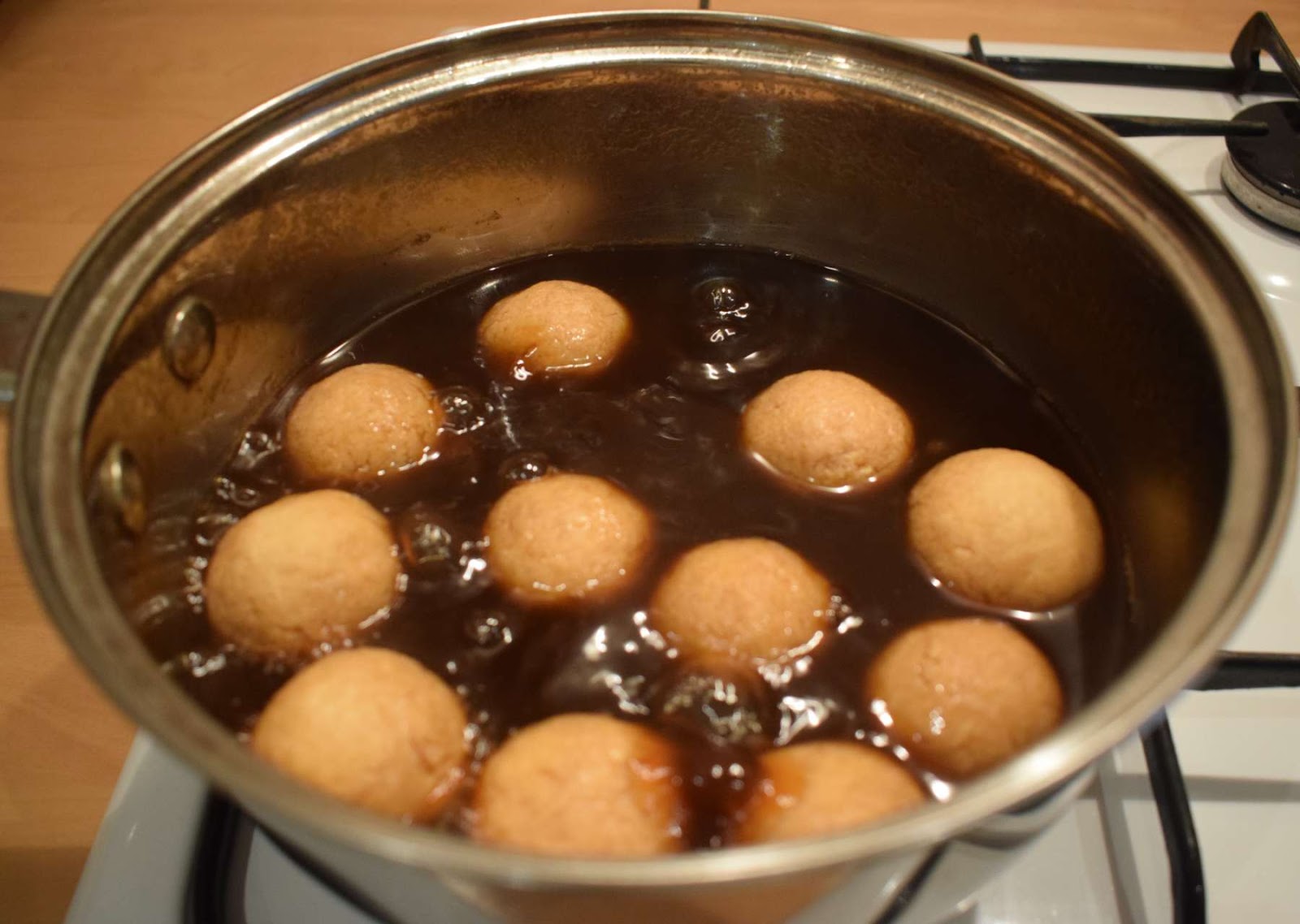 - Dunk the Chenna balls into the boiling sugar syrup one by one immediately.
