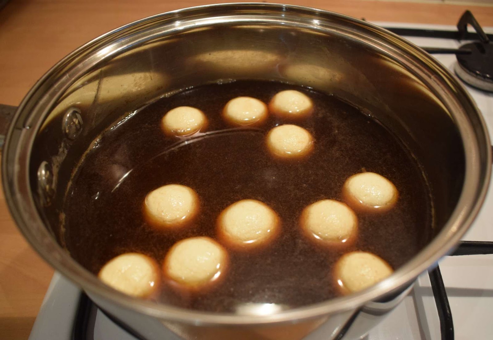 After adding Sugar and date palm jaggery into Water, once the syrup gets boiled and properly dissolved, immediately dunk the Chenna balls into the syrup.