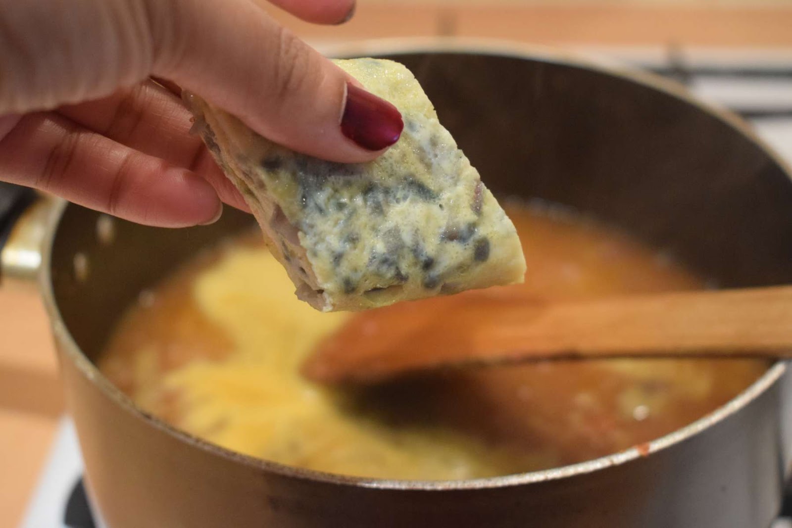 - Put the flame in low and add the pieces of Omelettes into the pan.