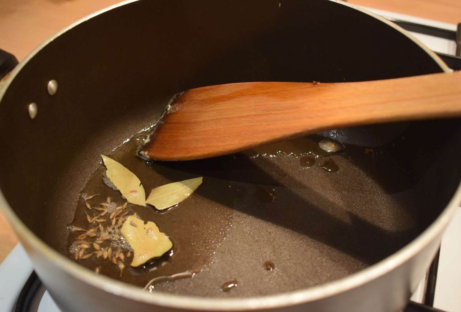 - Once the oil is hot, add Cumin seeds (Jeera), Bay leaves (Tejpatta) and let them crackle.