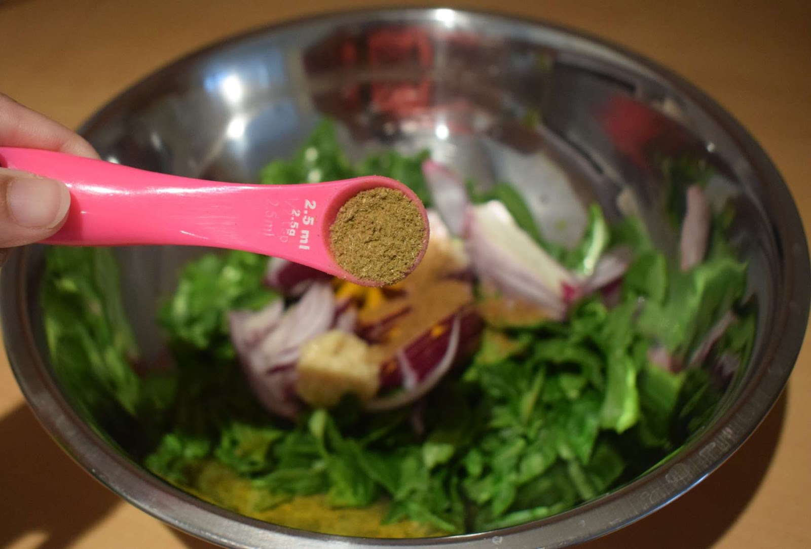 - Add Salt, Turmeric powder, Chilli powder, Cumin powder, Coriander powder into the mixing bowl one by one and mix it nicely.