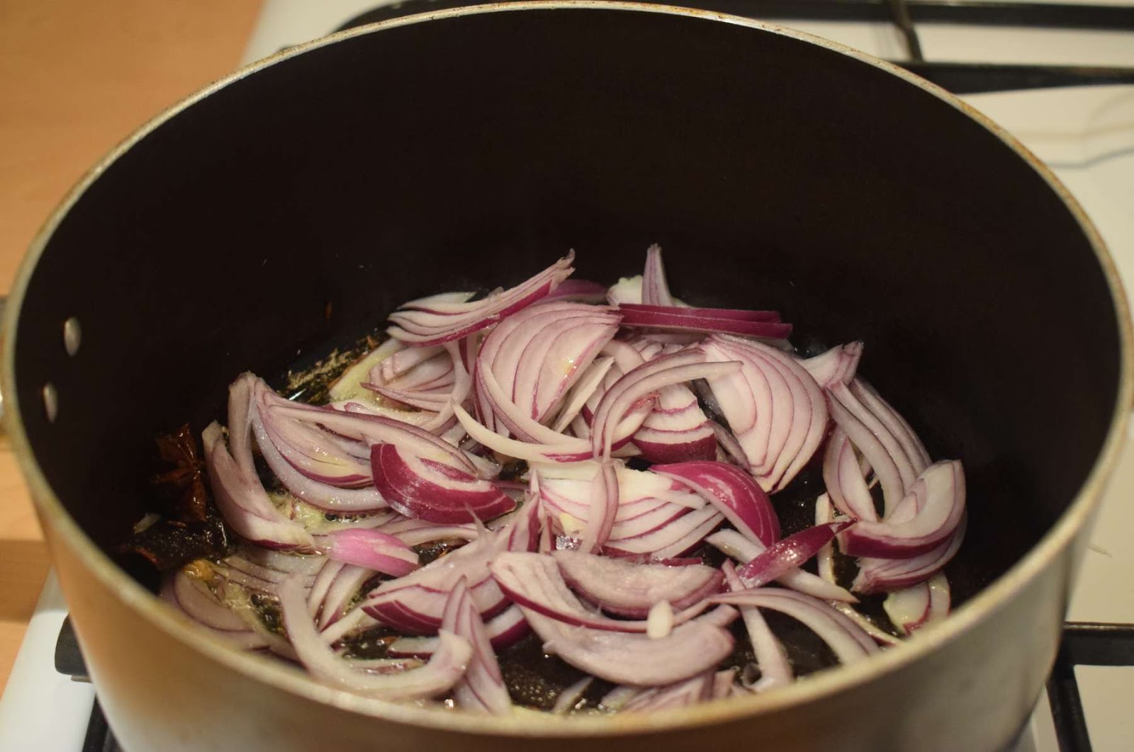- Add sliced onions into the pan and cook them in medium flame for 3-4 minutes until it becomes translucent.