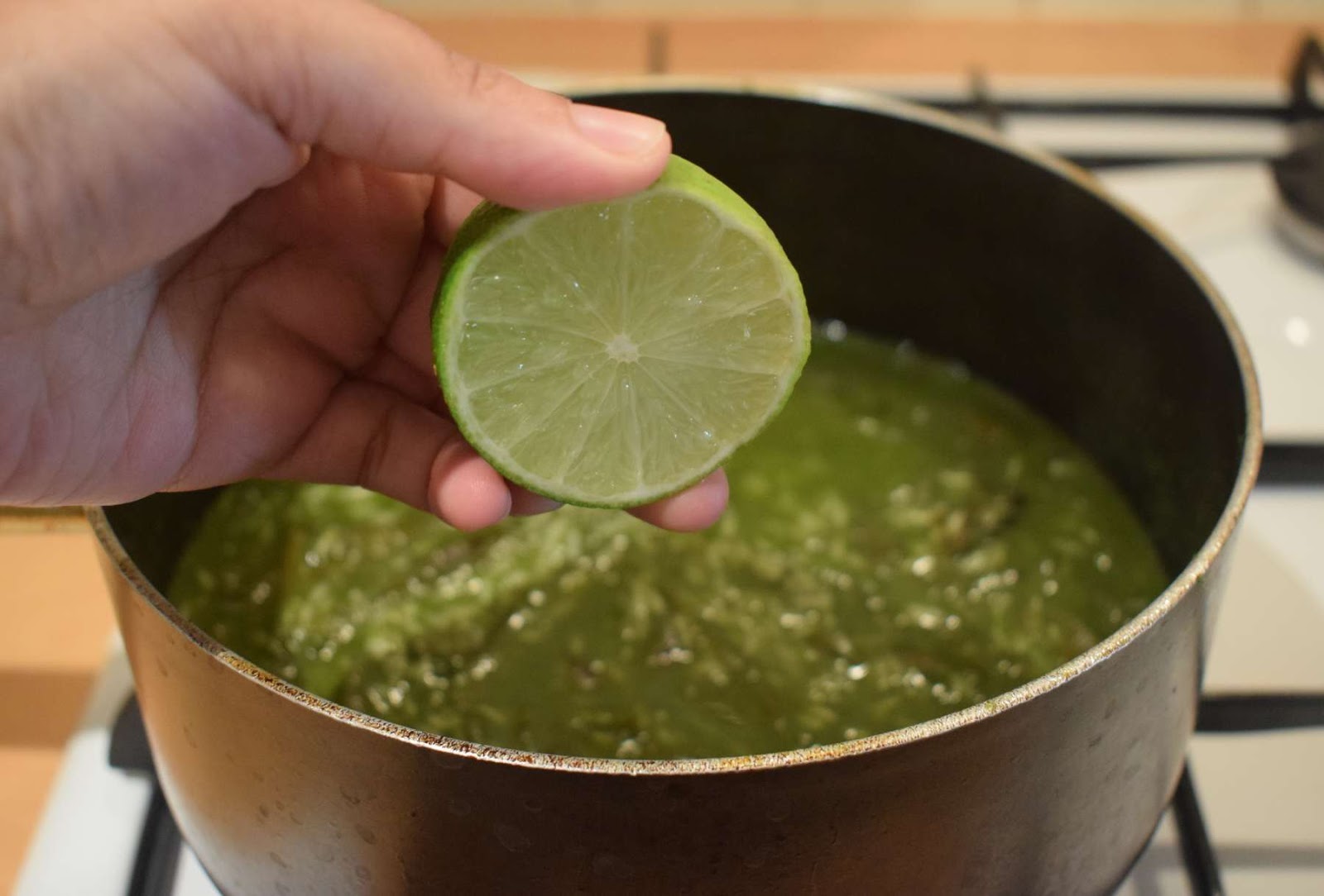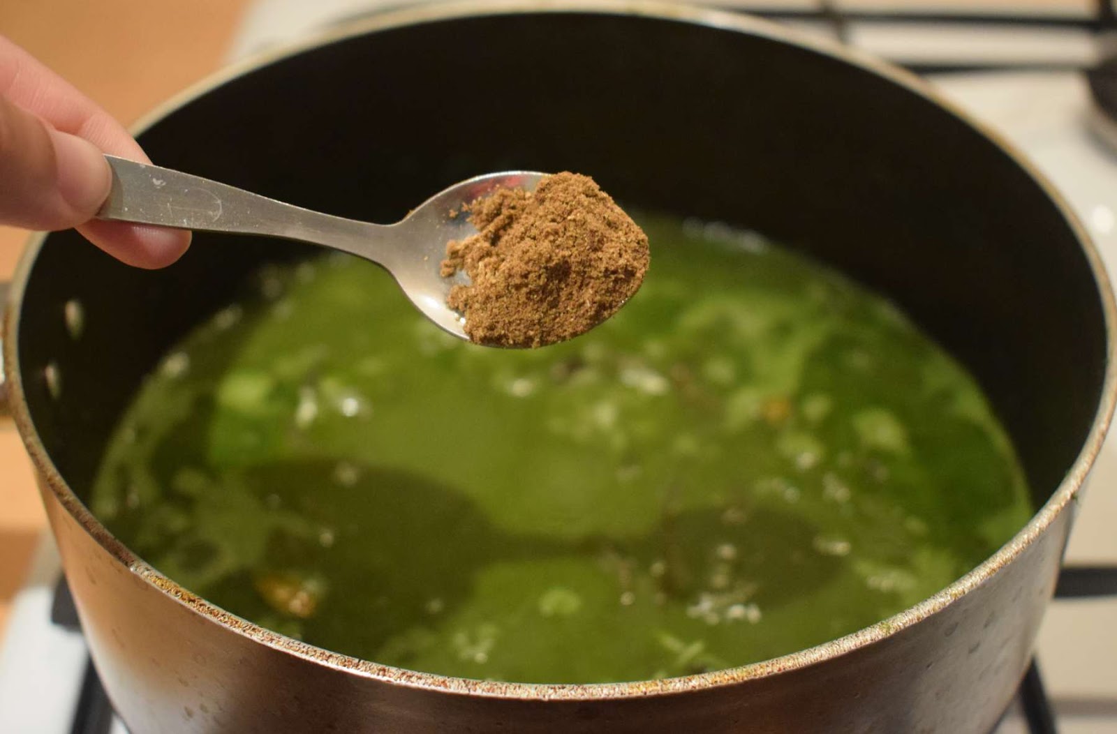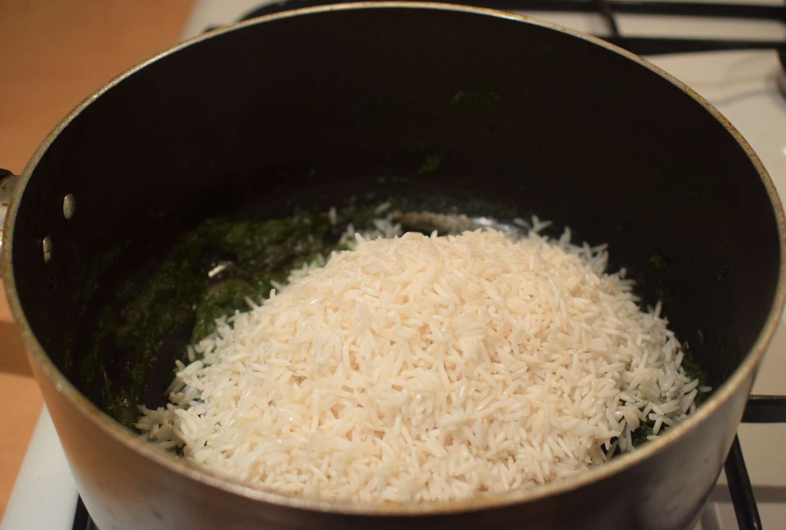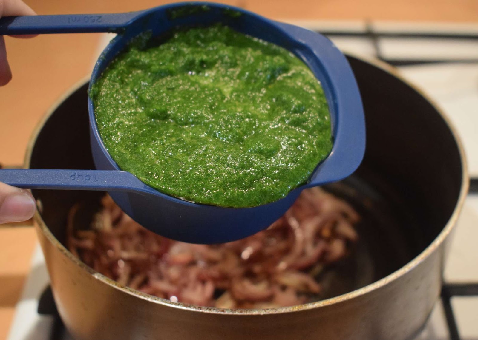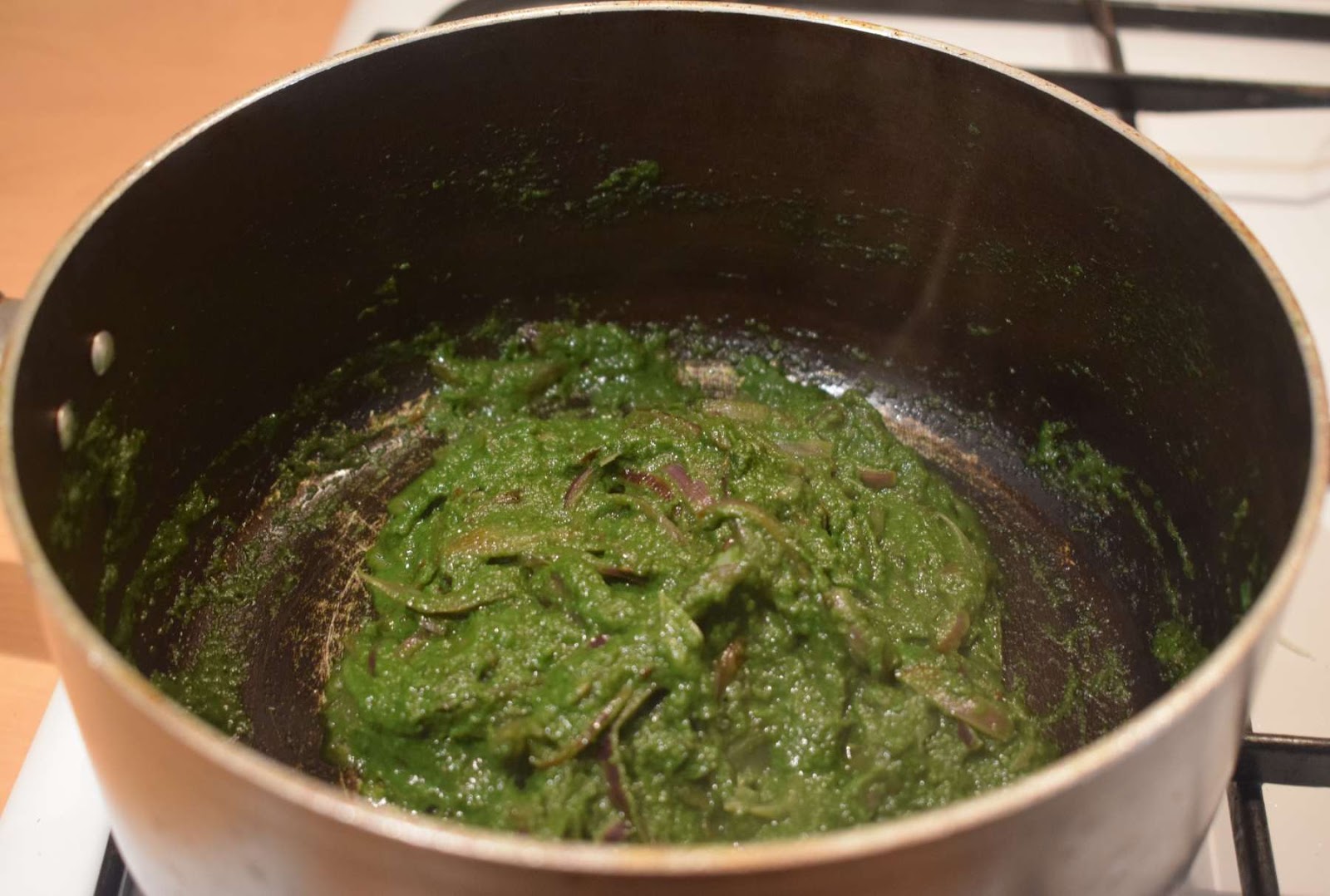 - Add spinach puree (Step 6) into the pan and give a nice stir.