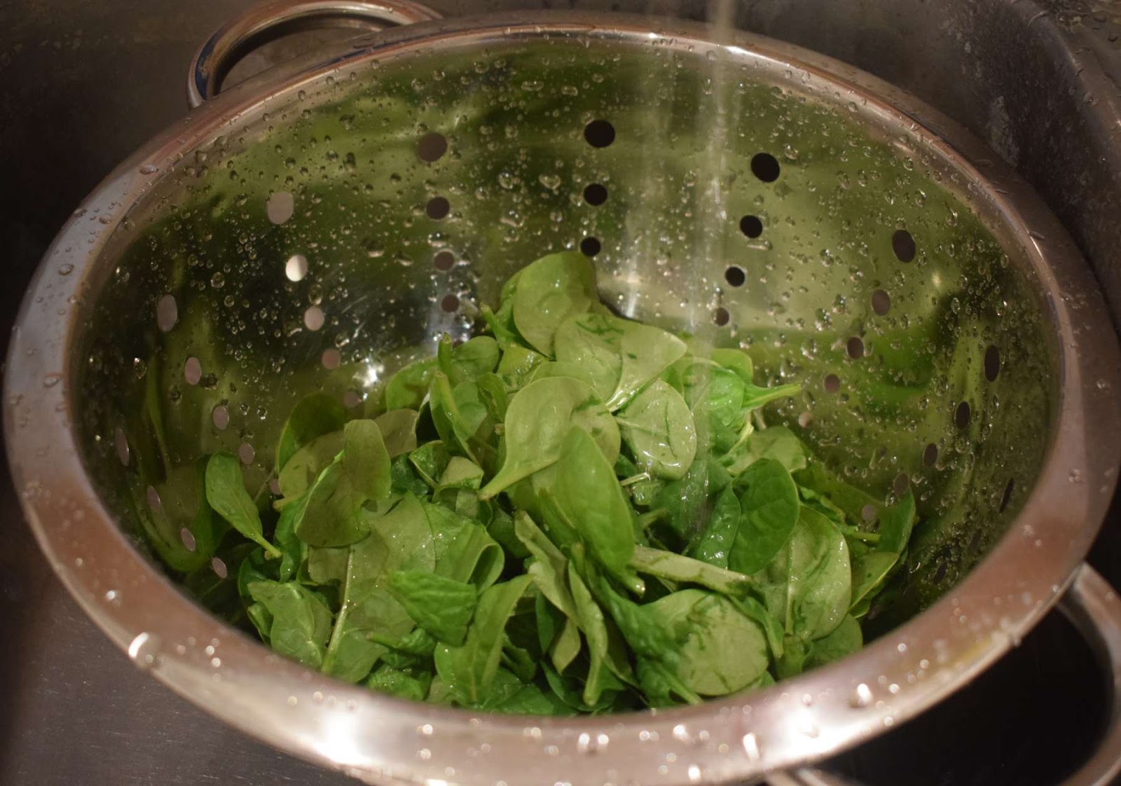 - Wash the spinach leaves in a colander and drain the excess water.