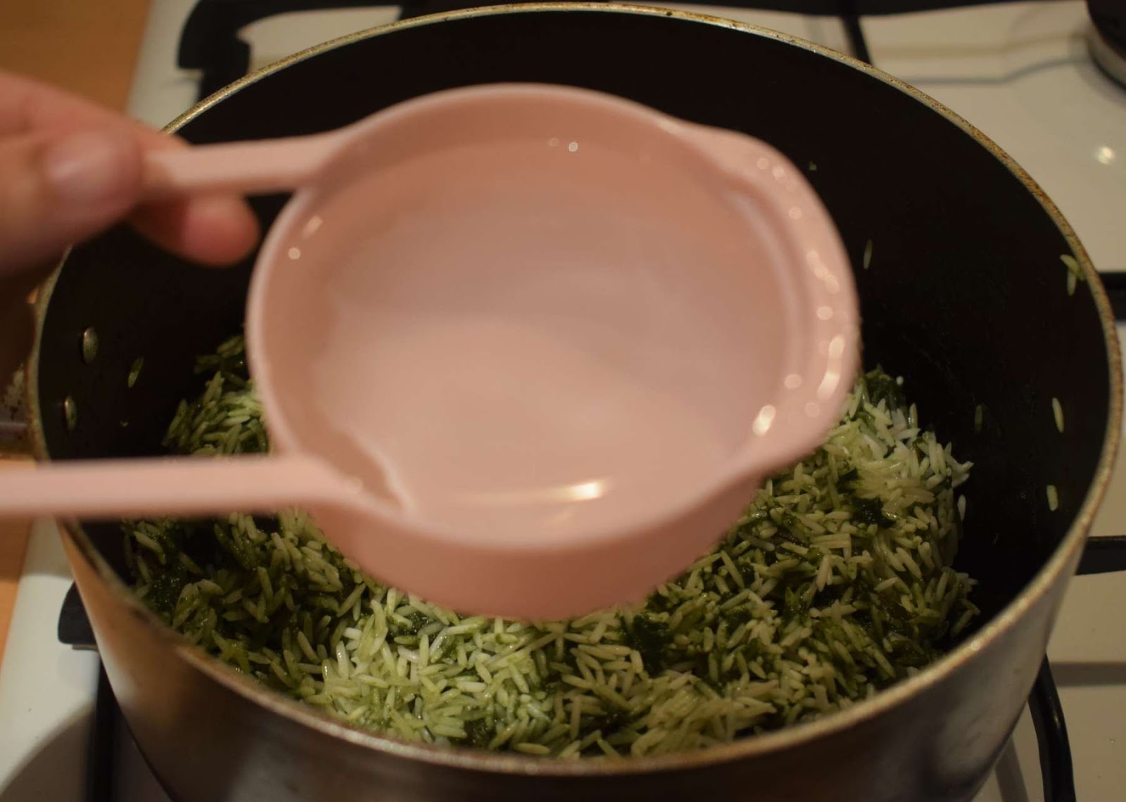 - Add 1 and 1/3 cups of water into the pan and give a nice stir. If you prefer soft rice, then use 1 and ½ cups of water.