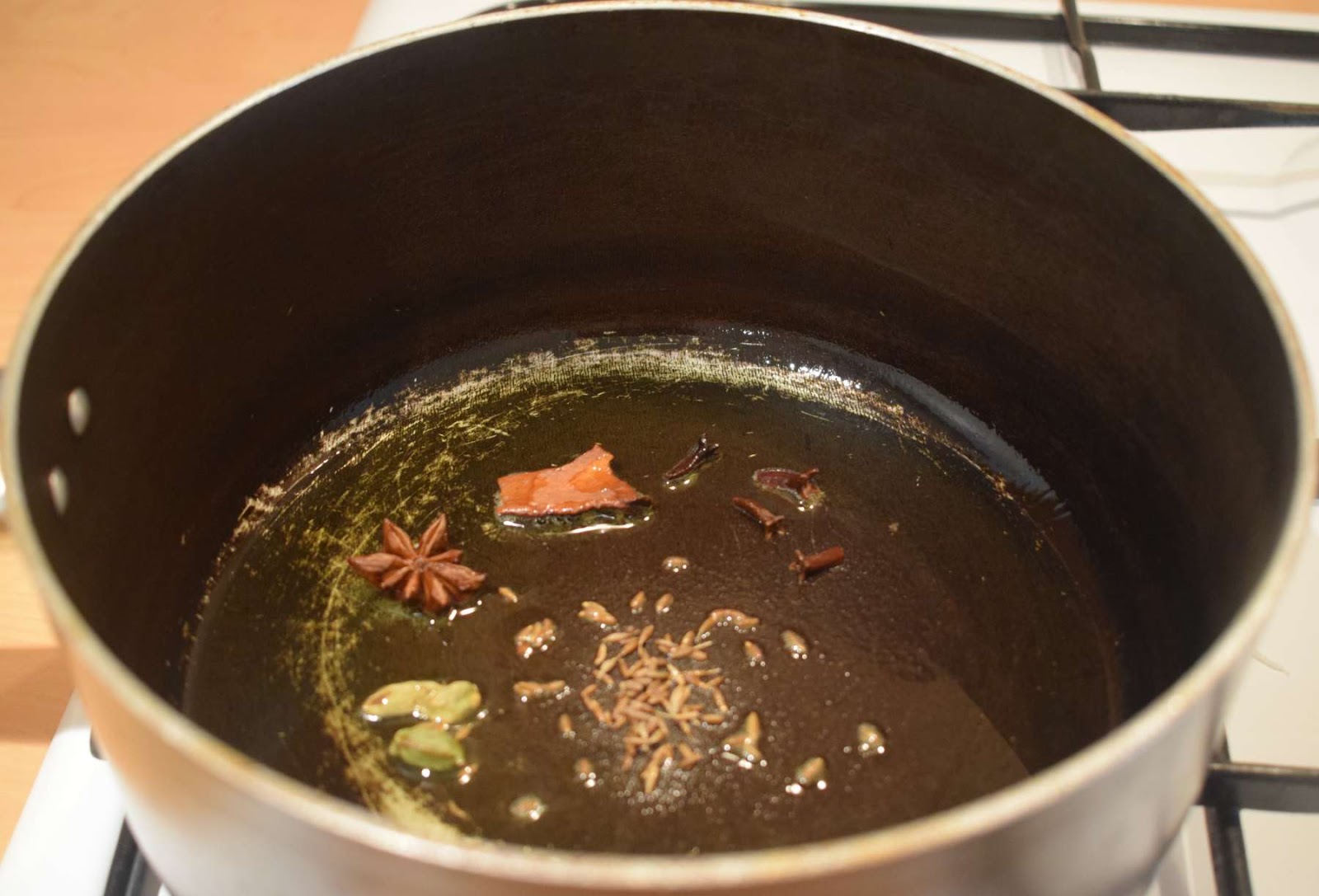 - Once the ghee or Oil is hot, add cumin seeds, cloves, cinnamon stick, cardamoms, star anise into the pan and let them crackle.