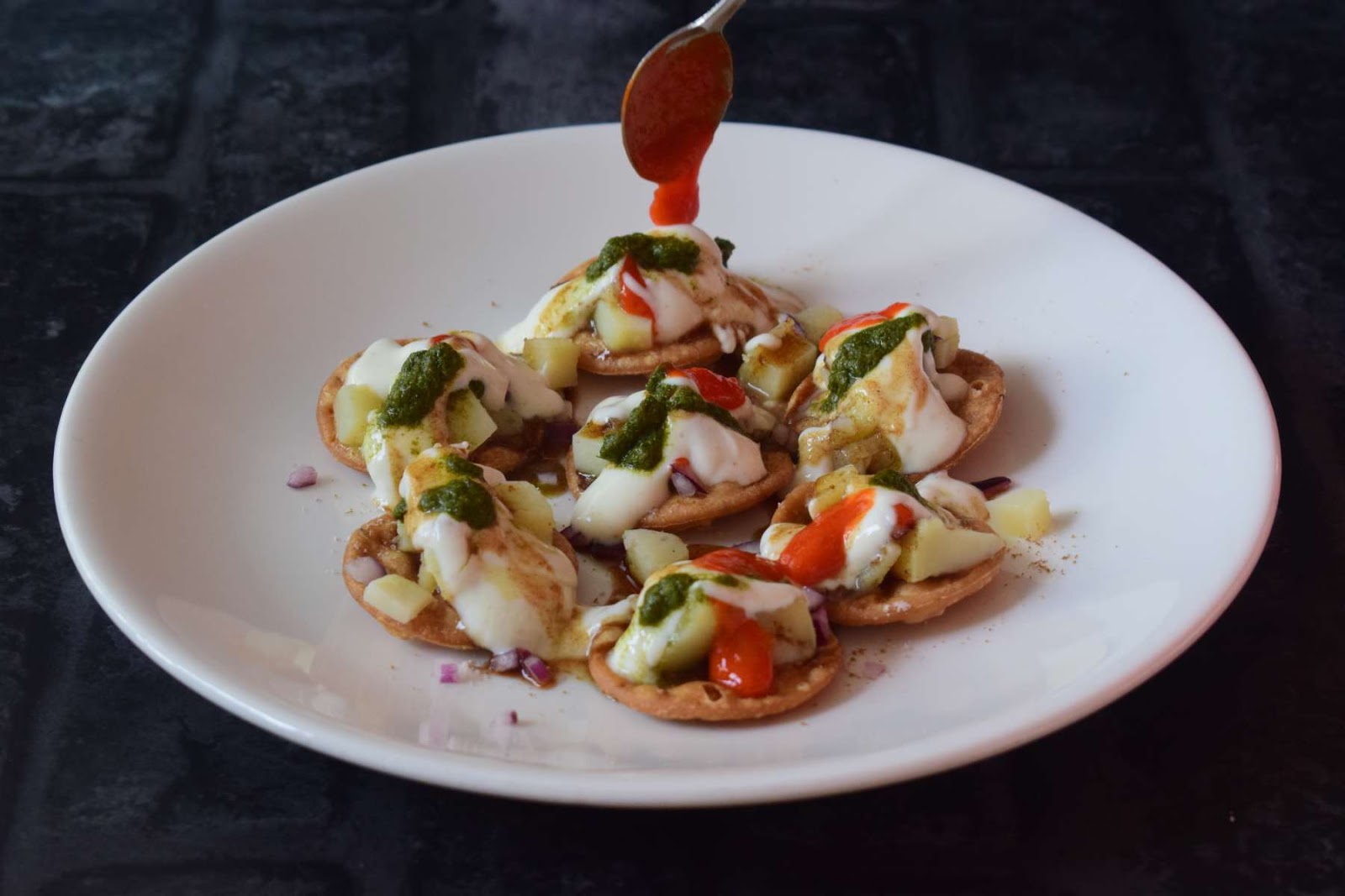 - Then add Red chutney and Green chutney one by one on each Papdis.
