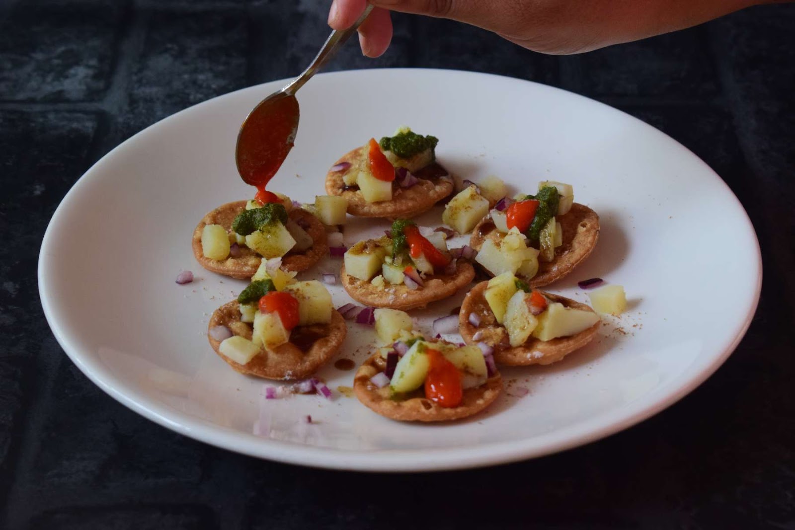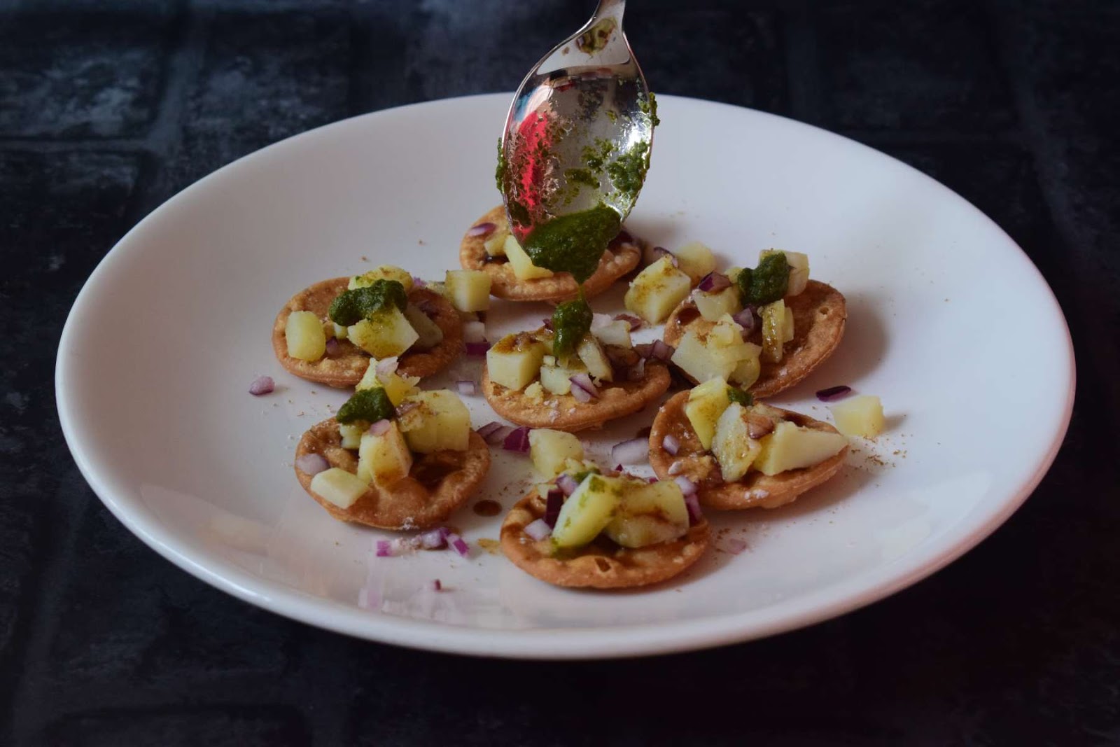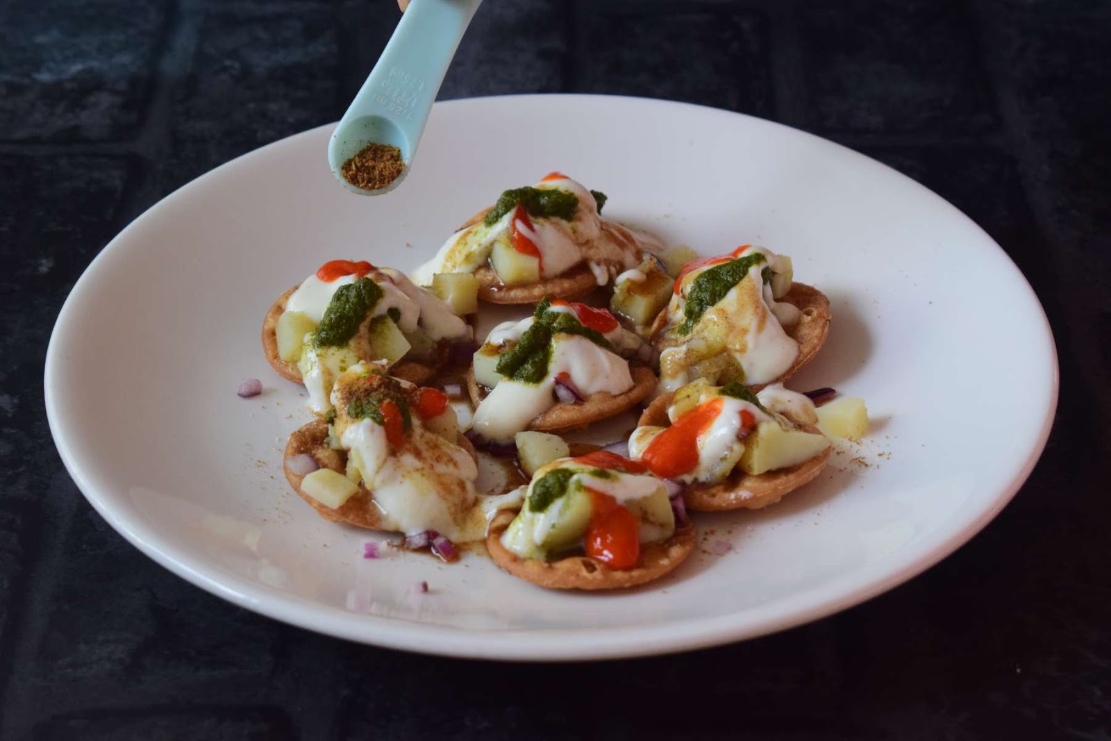 For plating, I arranged the papdis on a plate and added boiled Potatoes on it. Then I have added the Onions, Cilantros and sprinkled some Chaat masala and Roasted Cumin Powder.
