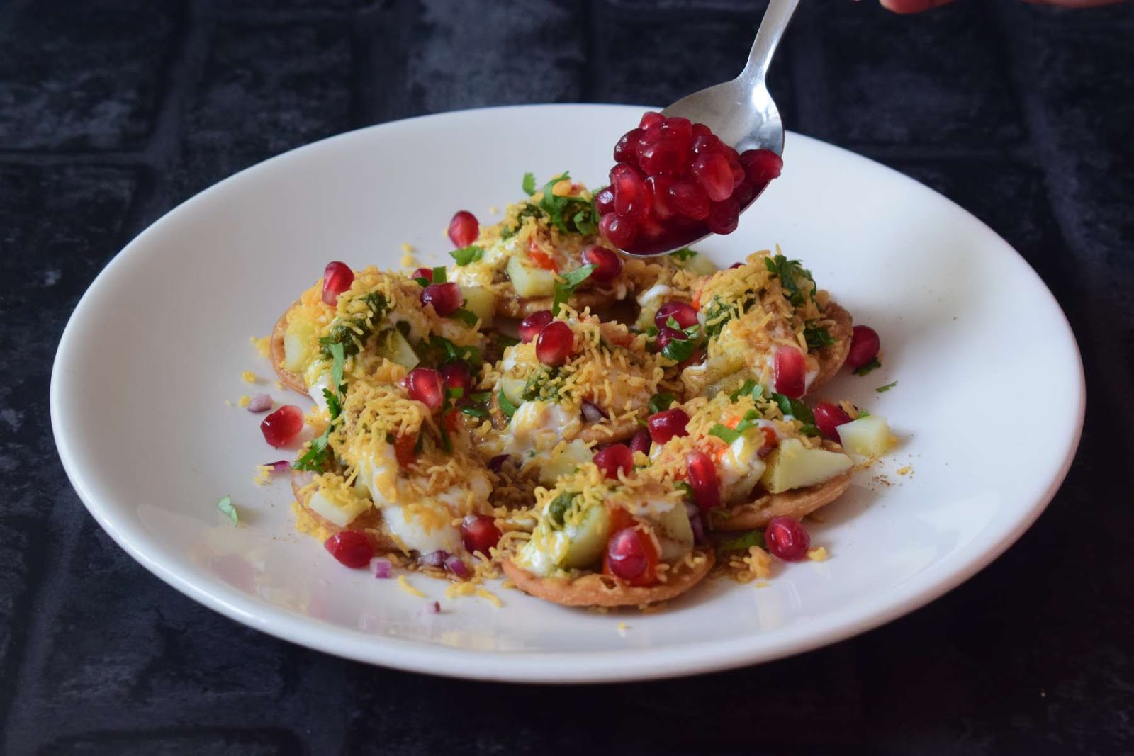 I have added generous amount of Yogurt and all the chutneys one by one. After this, I sprinkled some Pomegranate seeds and Sev at the end. Normally, very fine Sev is used for the recipe and its known as Nylon Sev. I have used the same for the recipe. If it is difficult to get, then normal Sev can also be used.