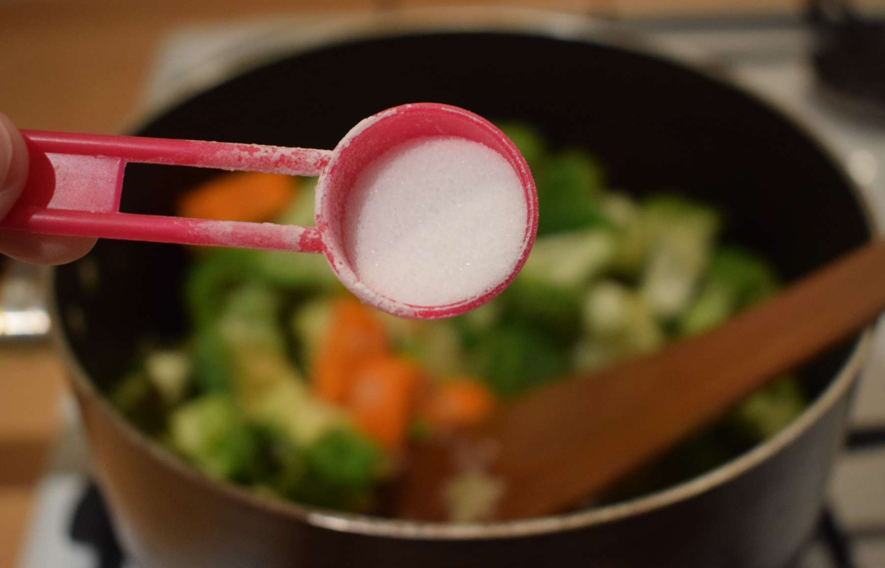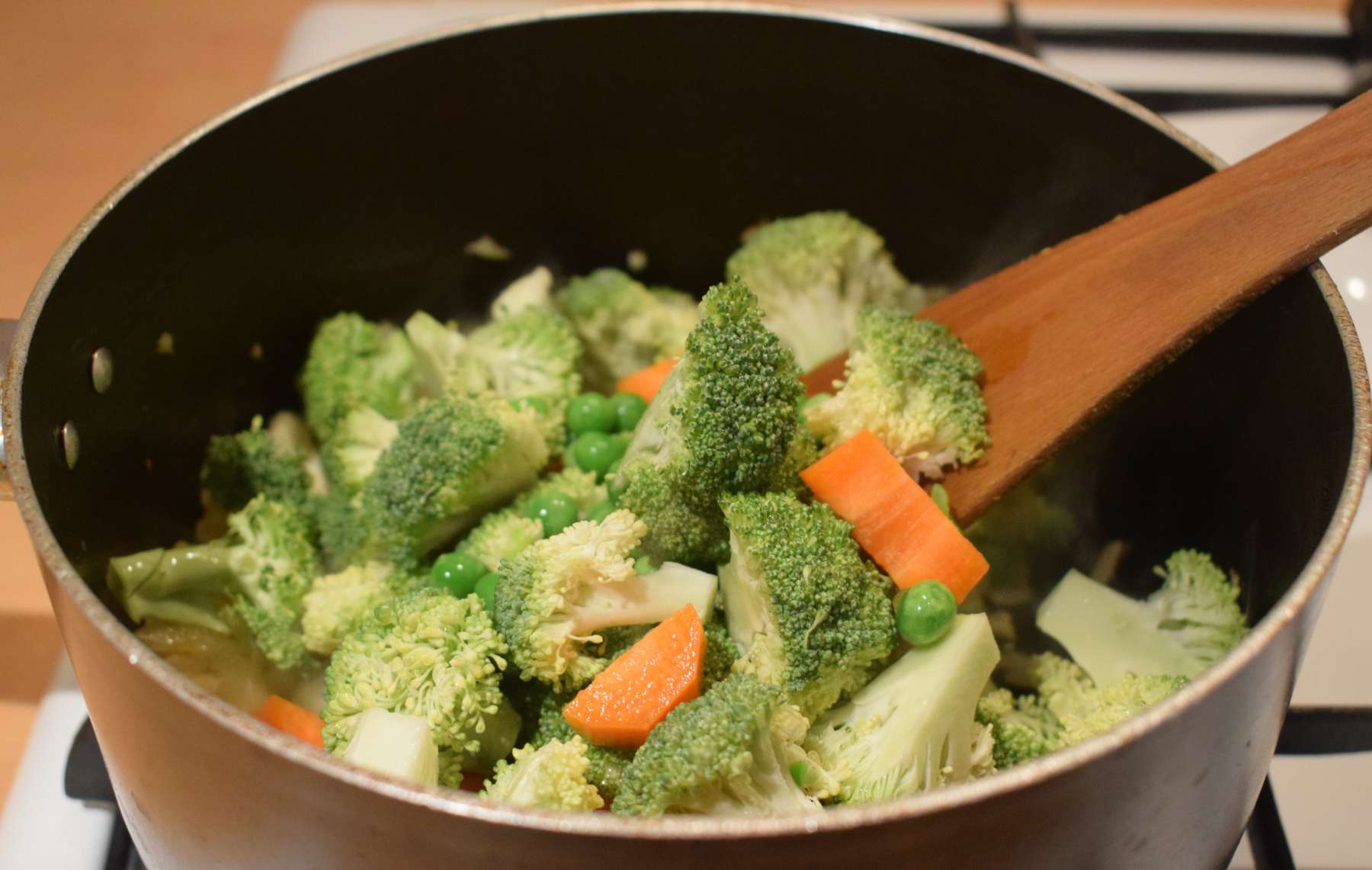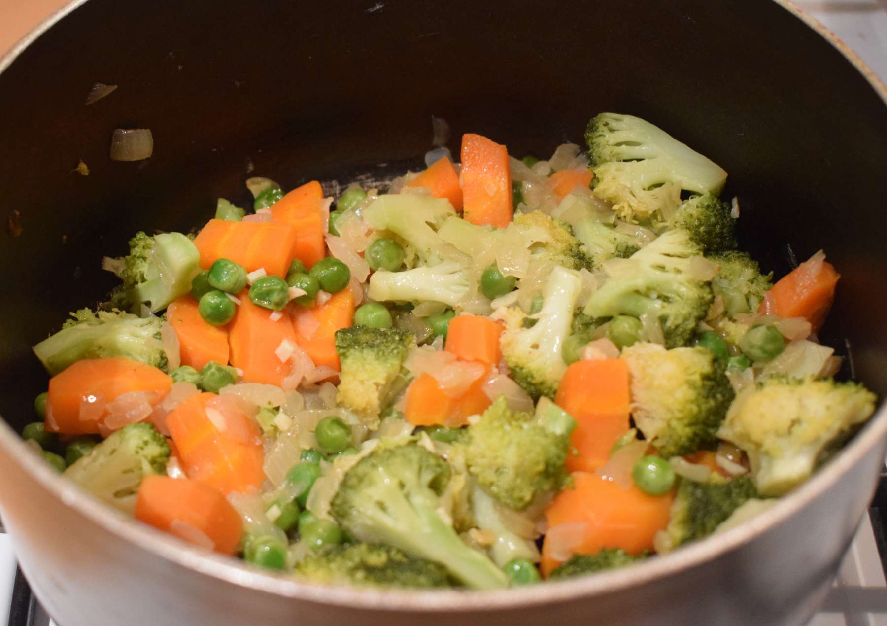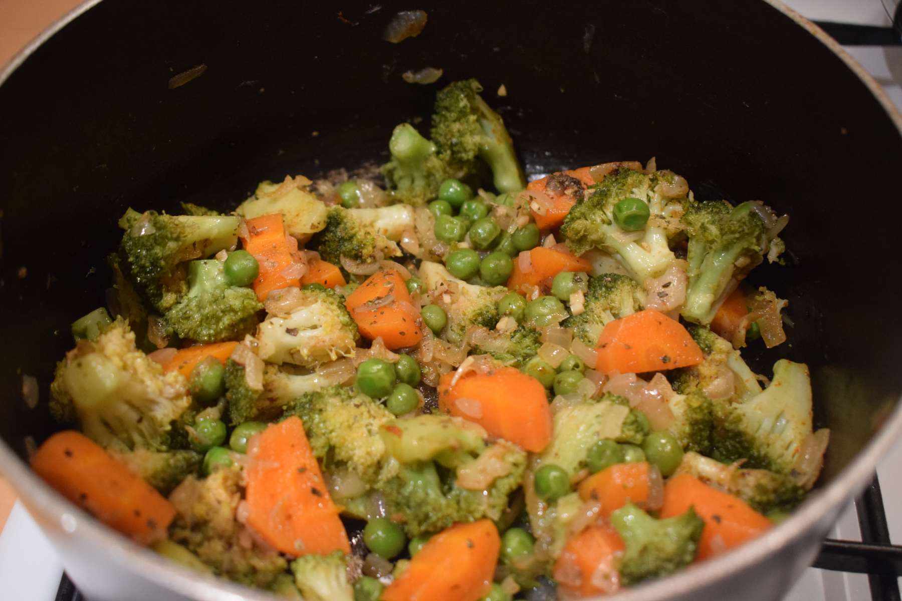 - Add broccoli florets, carrots, peas into the pan and give a nice mix.