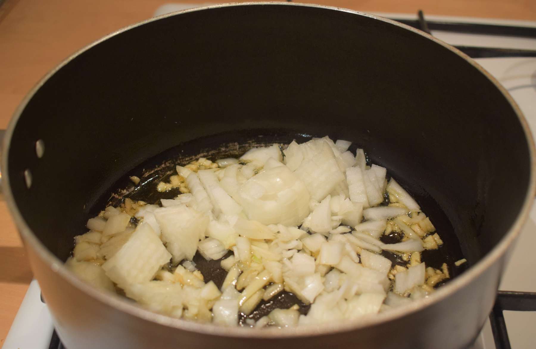 - Add the chopped onions into the pan and fry them in medium flame for 4-5 minutes. Stir when required.