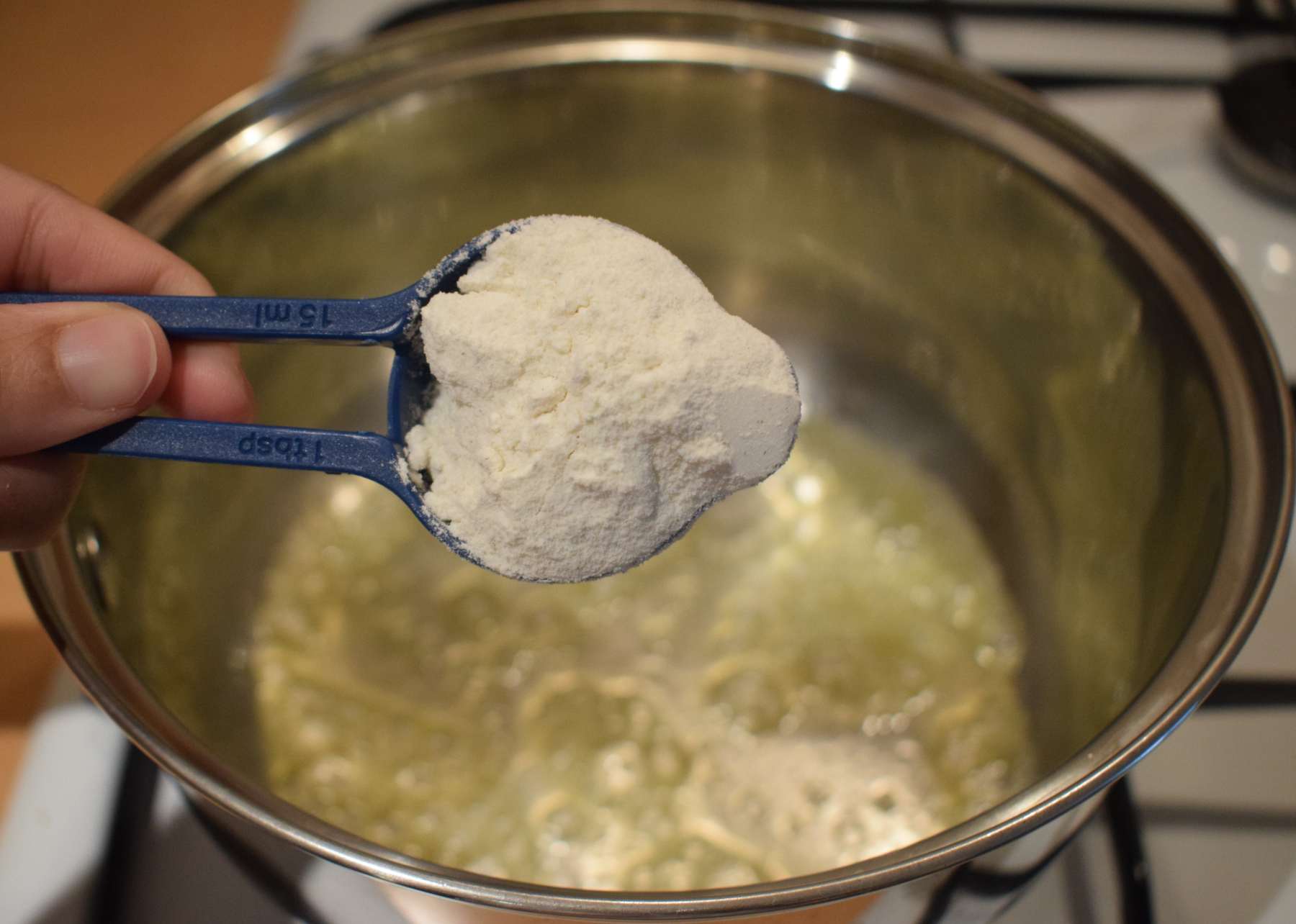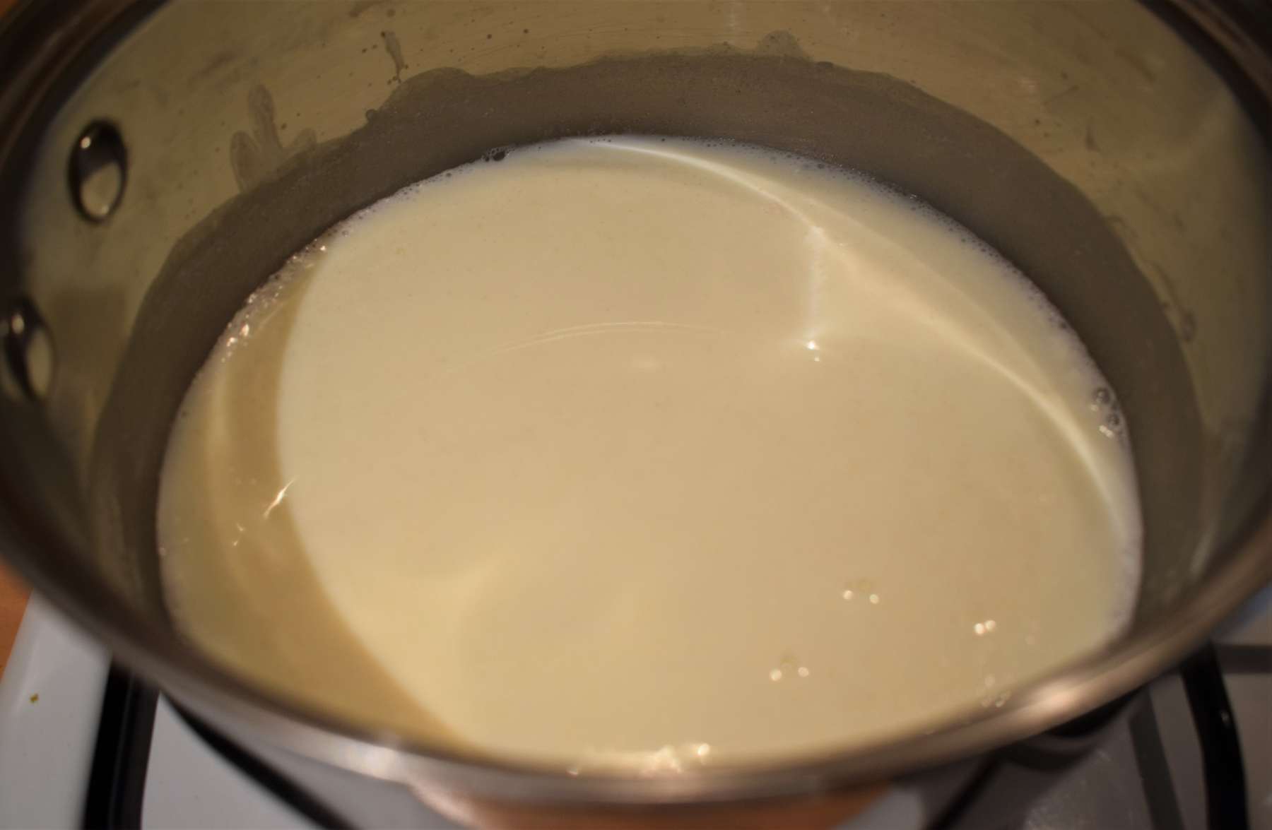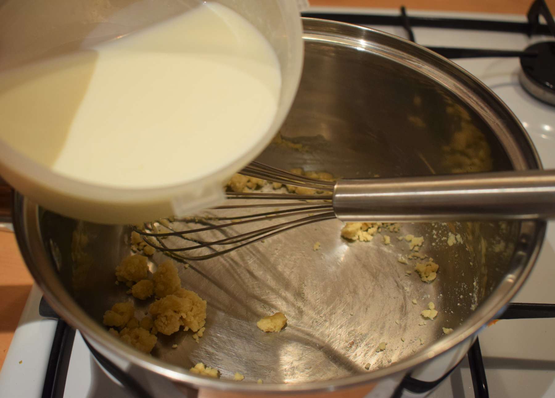 - Add 2 cups of milk into the pan and whisk it vigorously. Make sure there are no lumps.