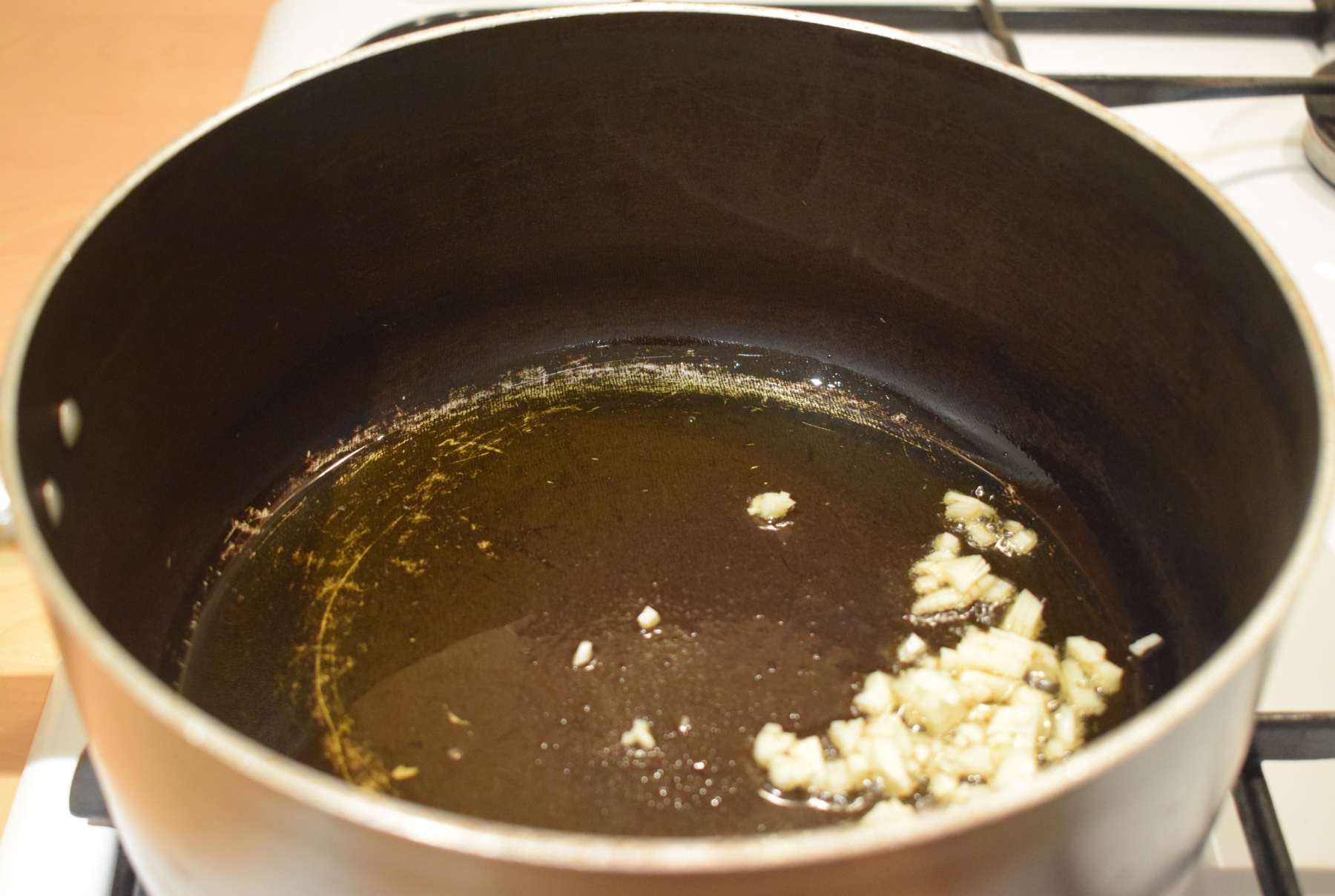 - Once the oil is hot, add chopped garlic and cook it till golden.