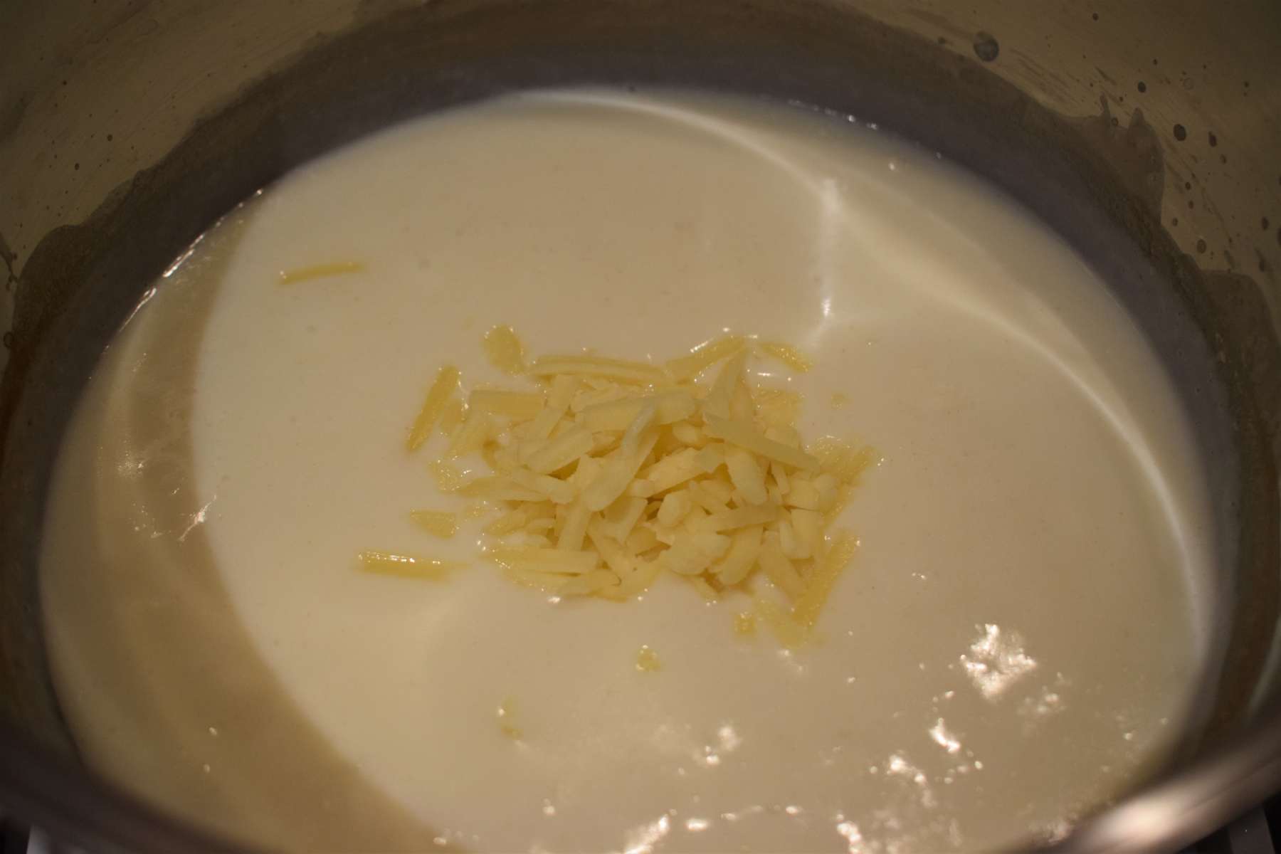 - Add 2 tablespoons cheddar cheese into the pan and stir it until the cheese melts.