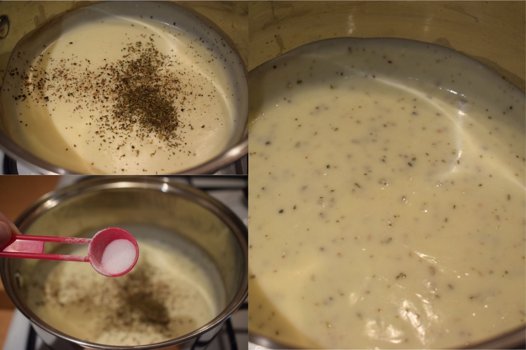 - Add salt, crushed black pepper, dried basil into the pan and mix it nicely. Keep the sauce aside.
