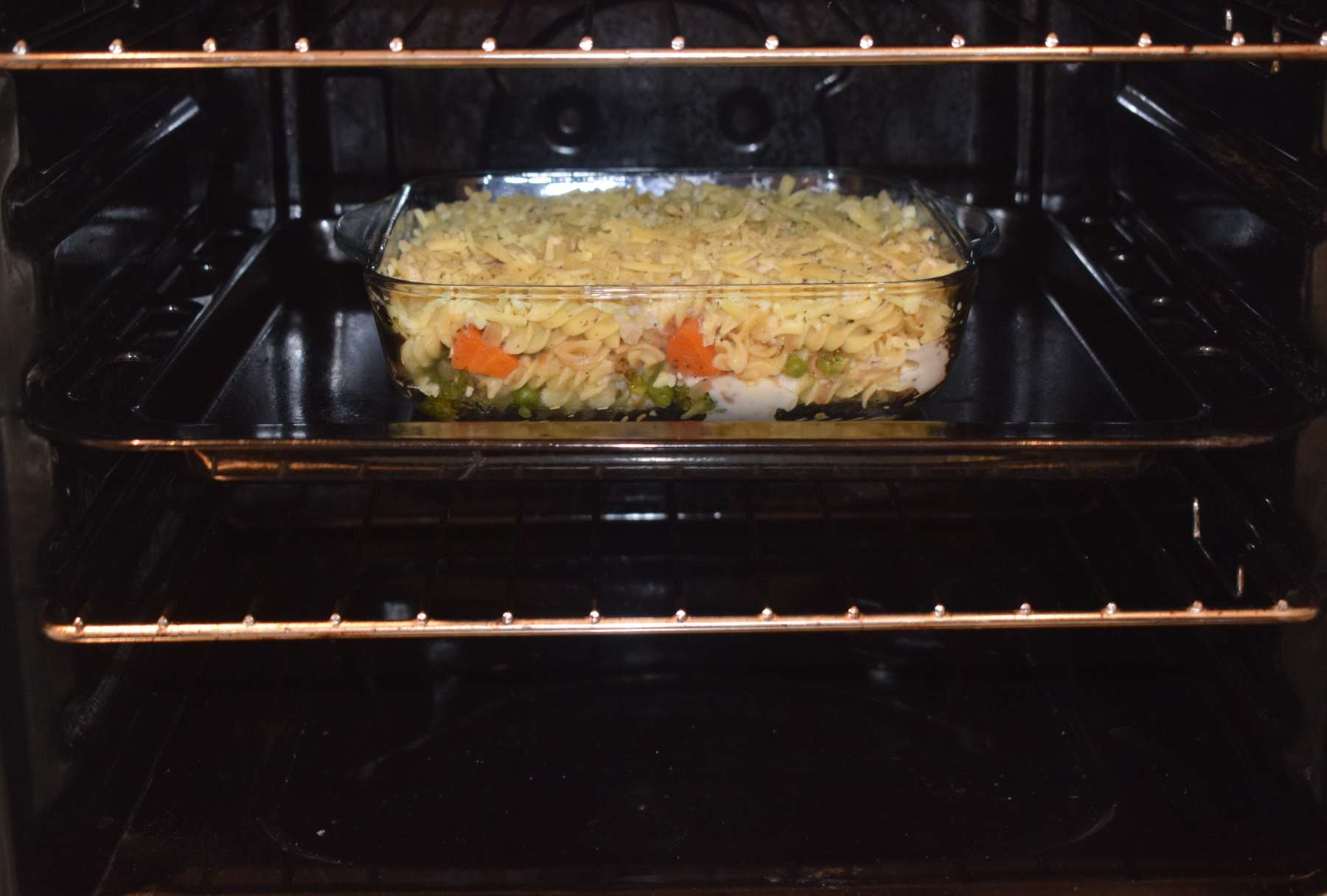 - Transfer the roaster into the middle of the preheated oven of 200°C/180°C fan/gas 6 for 25-30 minutes. Bake it until the cheese on the top melts and golden scar occurs on it. For me, it exactly took 26 minutes.