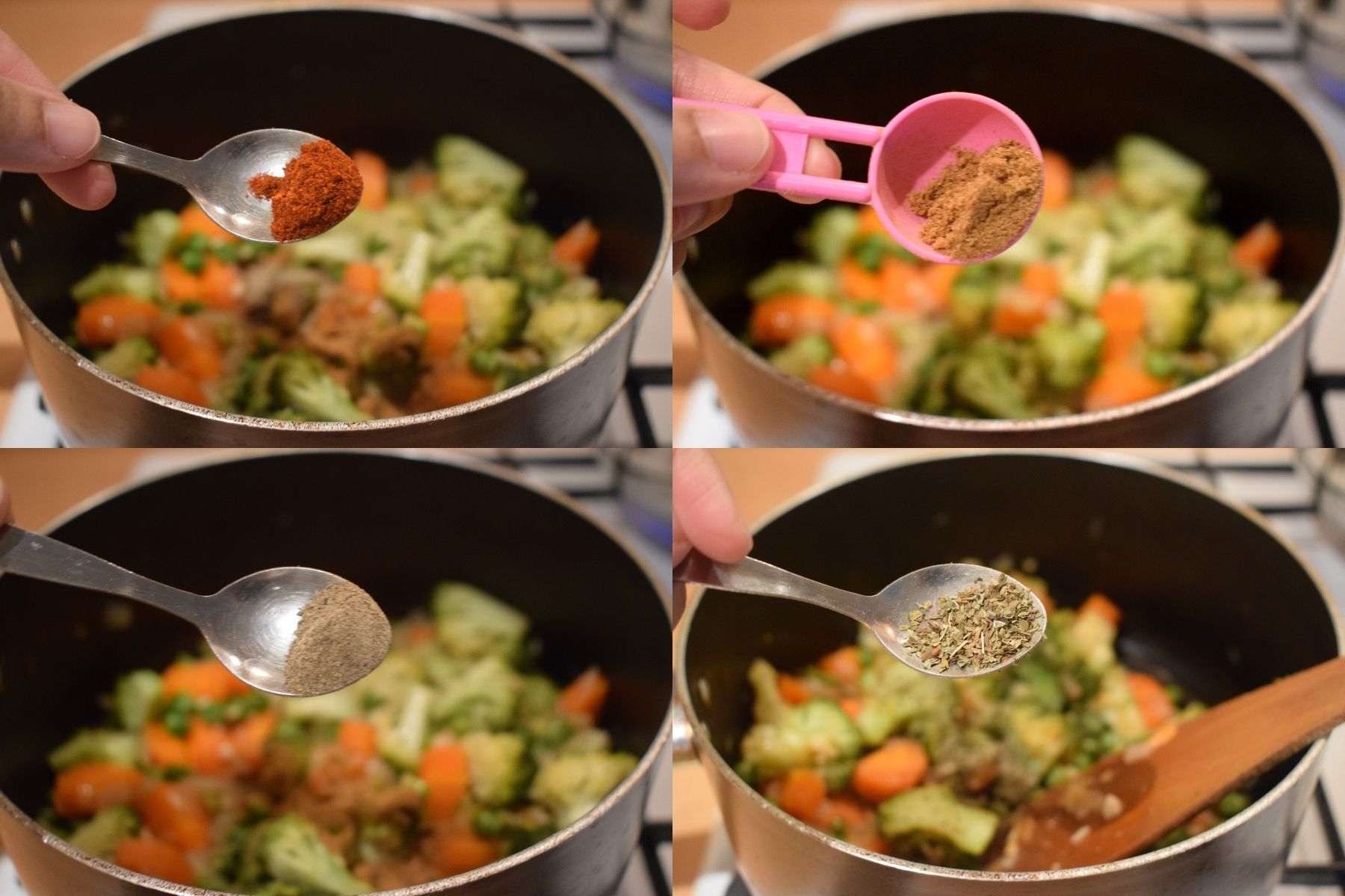 - Add smoked paprika, cumin powder, black pepper powder, mixed herb into the pan and mix it nicely.