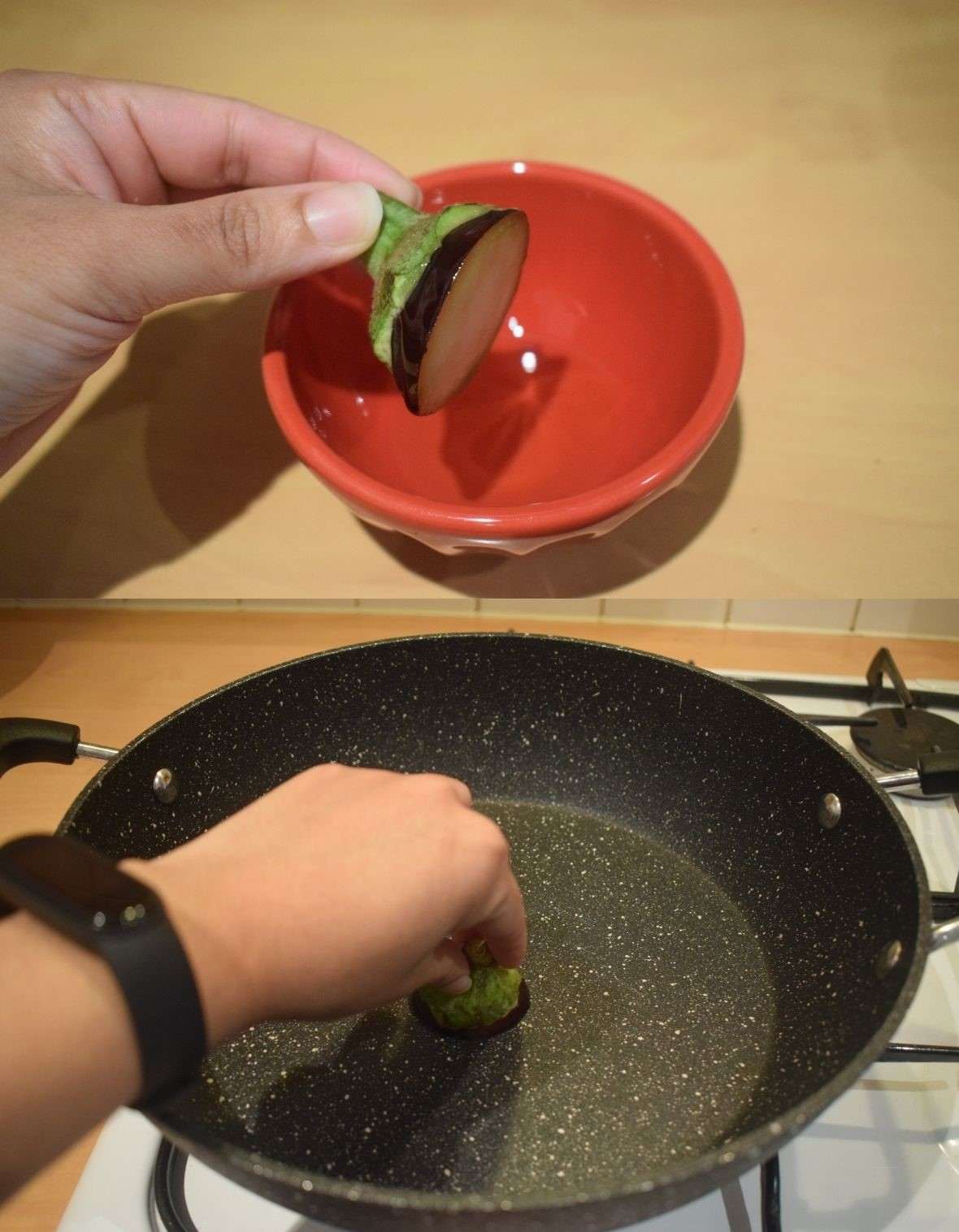 - Make a thin coating of oil or ghee in the pan either with brush or with the head of a clean brinjal stem.