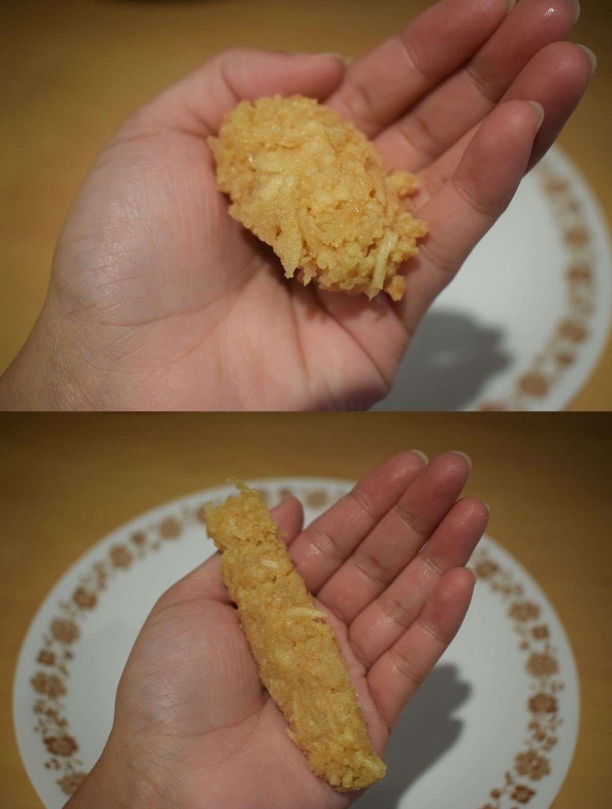 - Take small portion of the mixture in your hand and press it in between your palms to make a narrow cylindrical shape like a log with it. Repeat the process with rest of the coconut mixture.