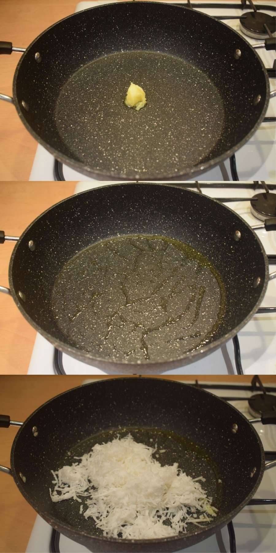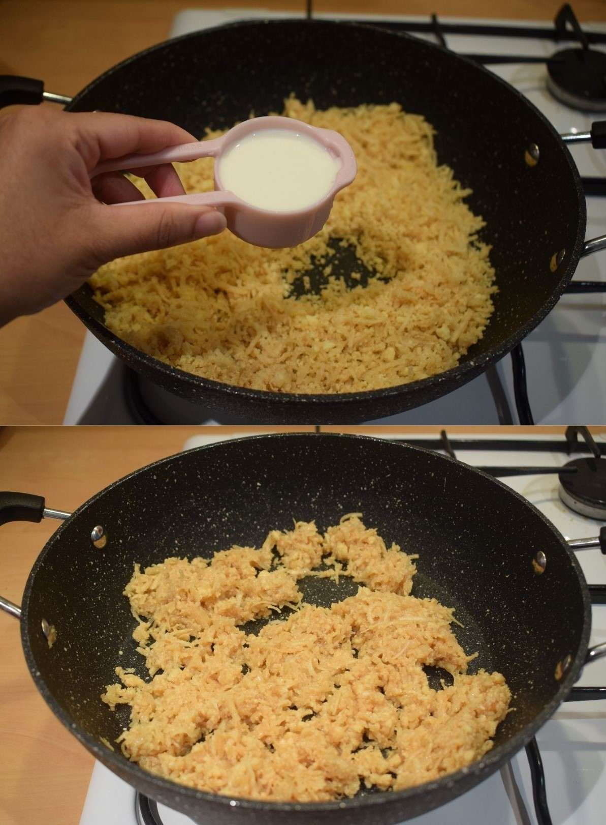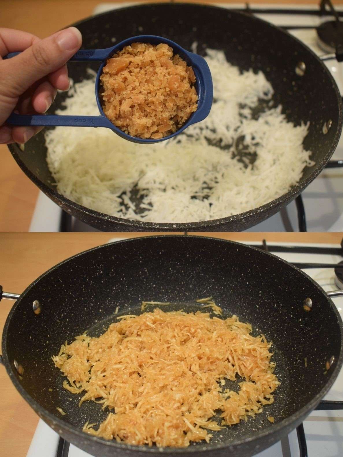 - Put a pan on flame and allow it to become completely dry. Add 1 teaspoon ghee (Clarified butter) into the pan and allow it to melt. Then add the grated coconut into the pan and toss it over medium low flame for 2 minutes so that the raw smell of the coconut goes away, and a nice nutty aroma comes out of it.