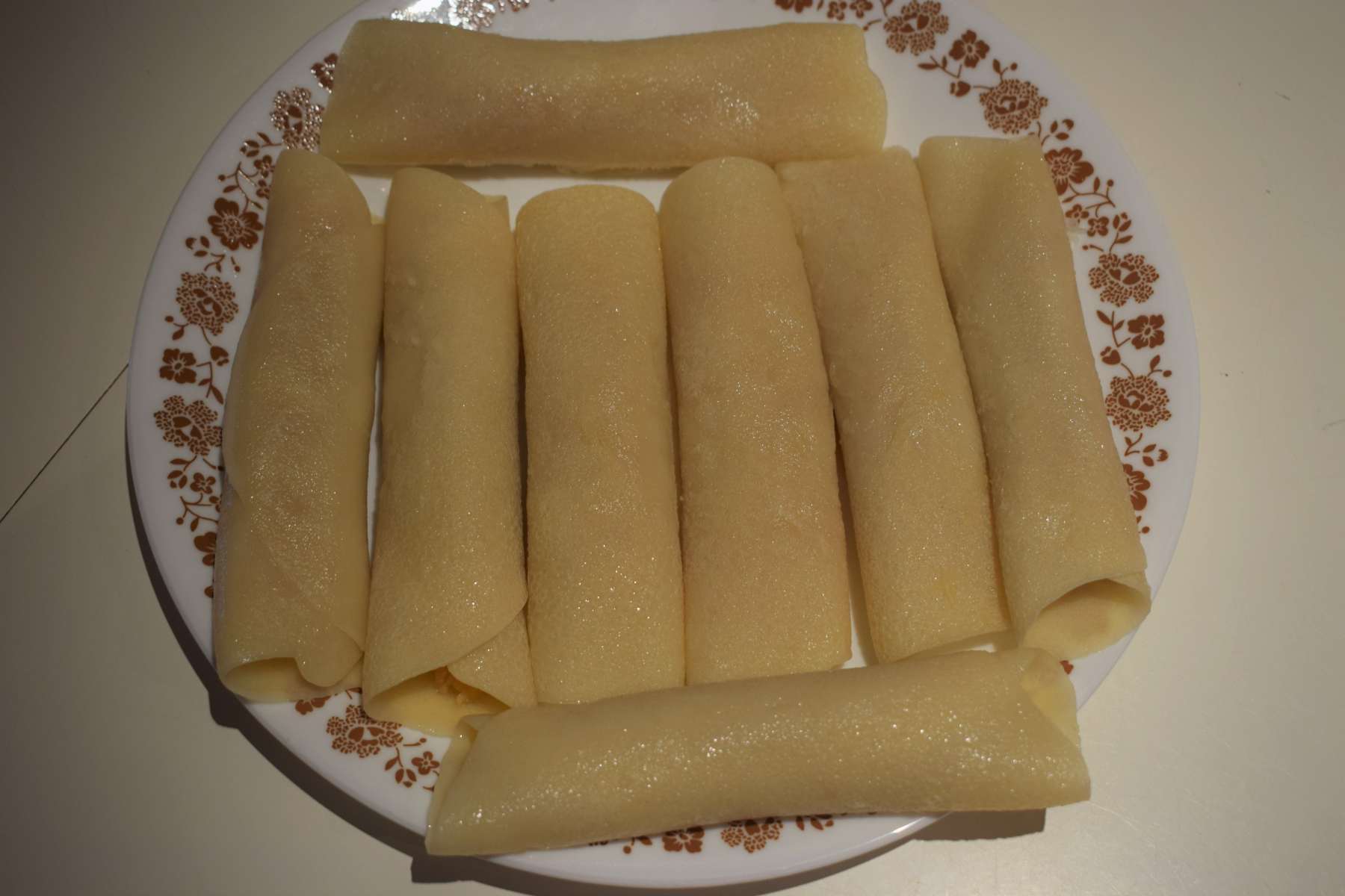- Place the cylindrical stuffing (Step 6) at one end of the crepe.