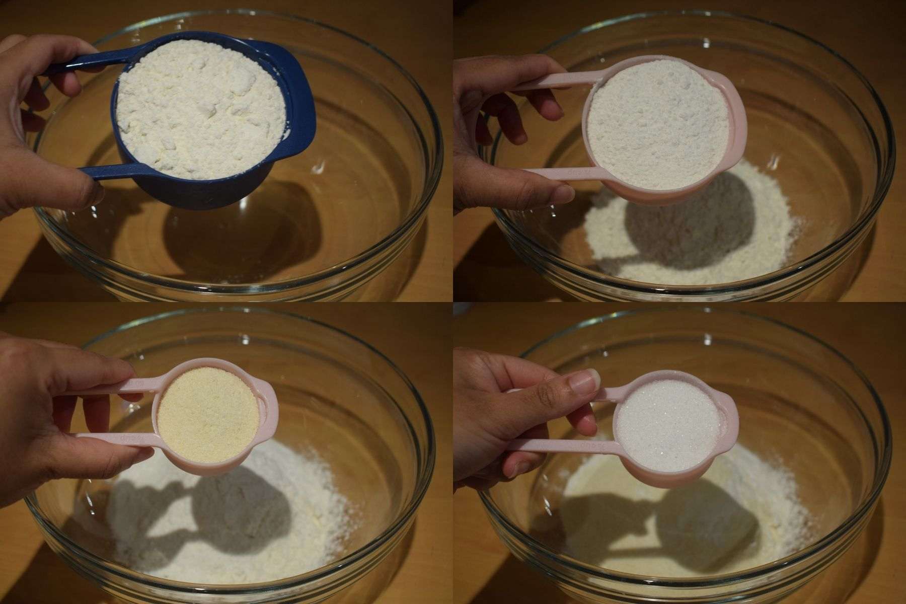 - Take a large mixing bowl and add 1 cup all-purpose flour, ½ cup rice flour, ¼ cup semolina and ¼ cup sugar, one by one into it.