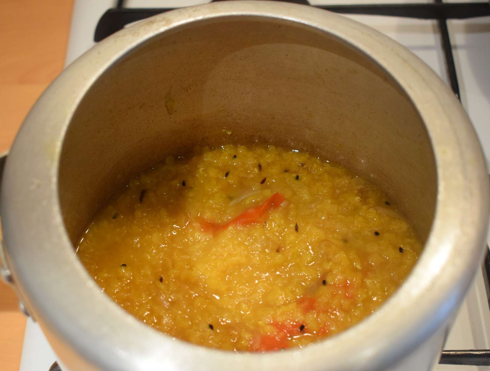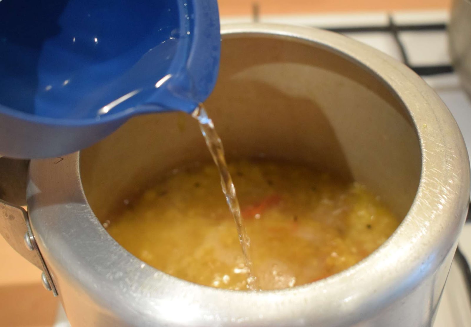 - Stir the dal, add 1 cup of water and let it cook for another 2 minutes in high flame until the dal simmers.