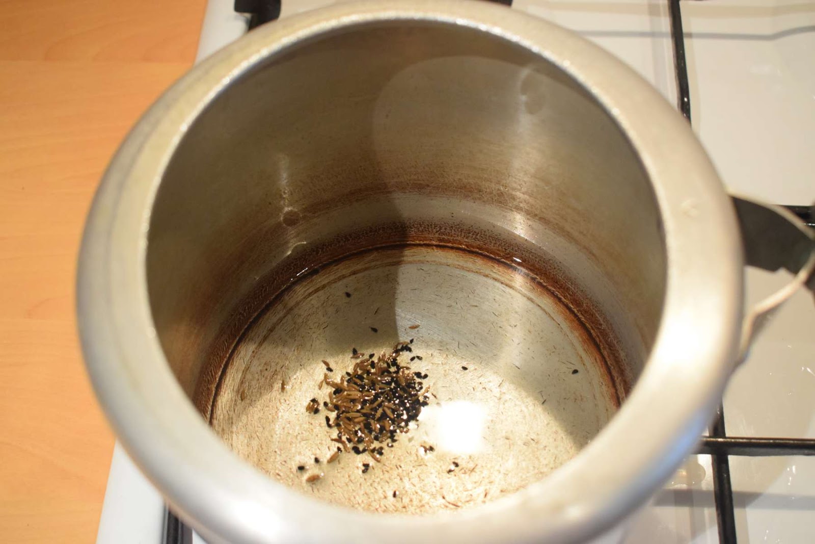 - Once the oil is hot, put Cumin seeds and Nigella seeds.