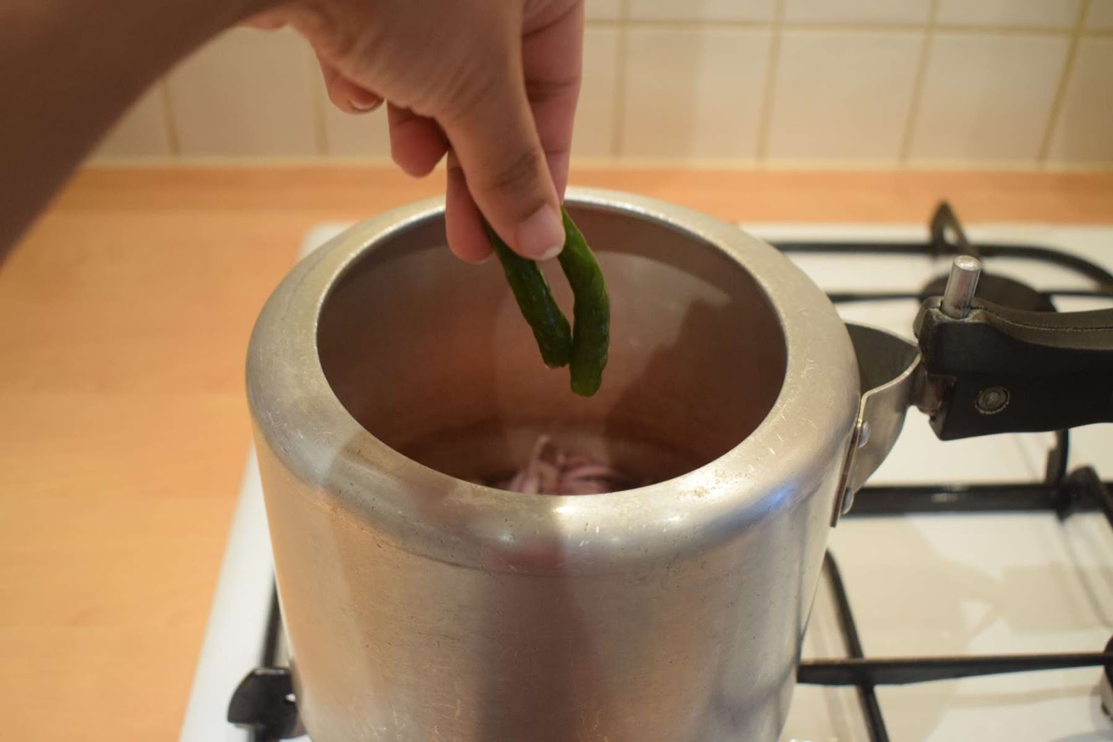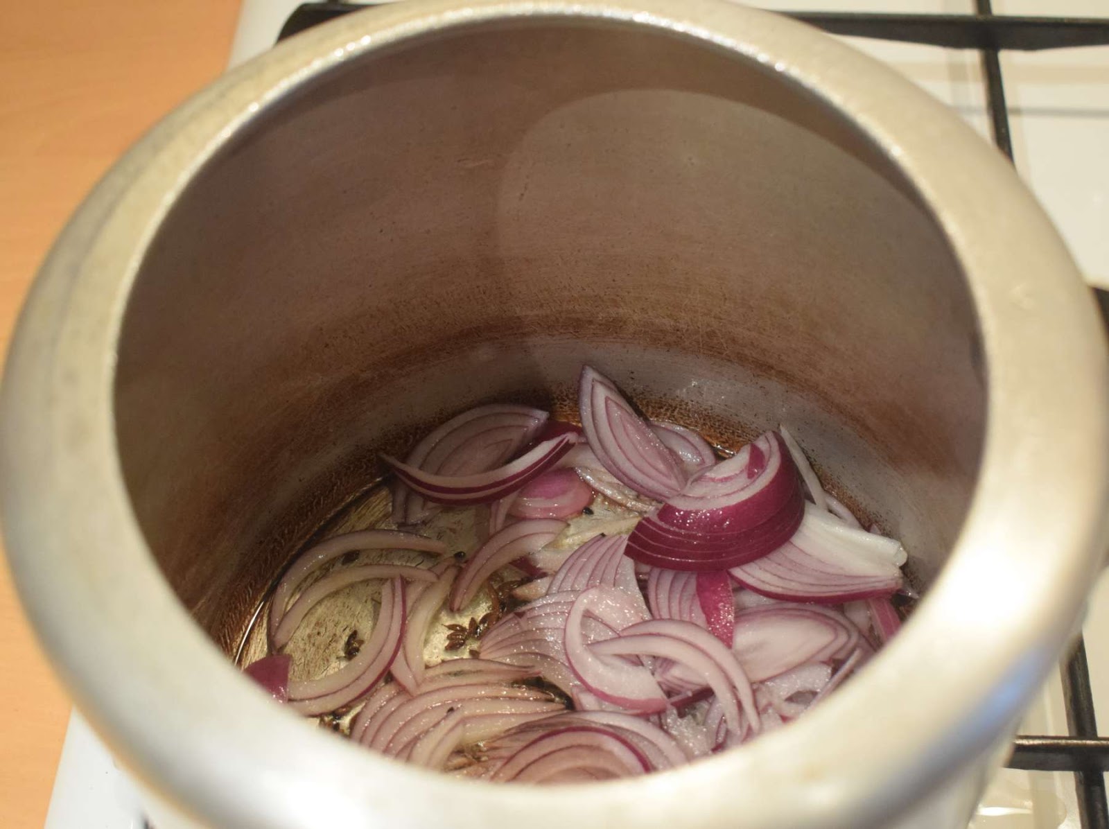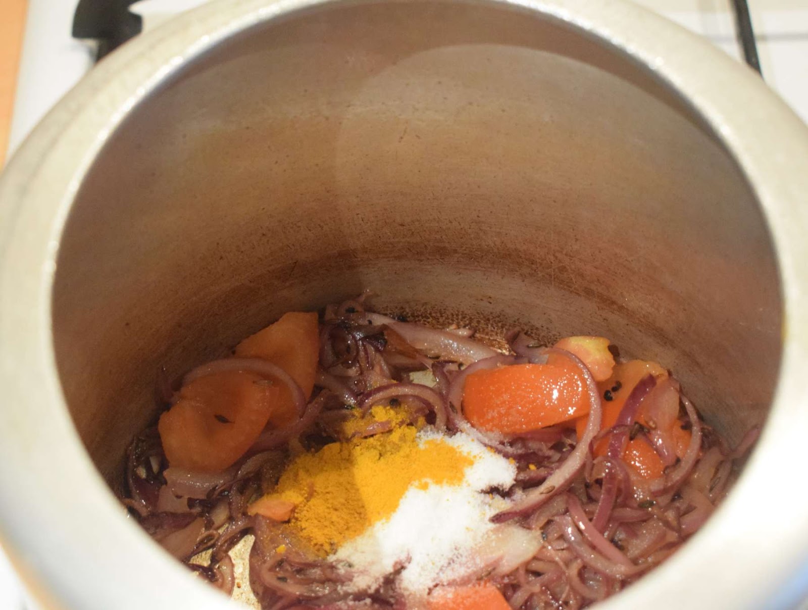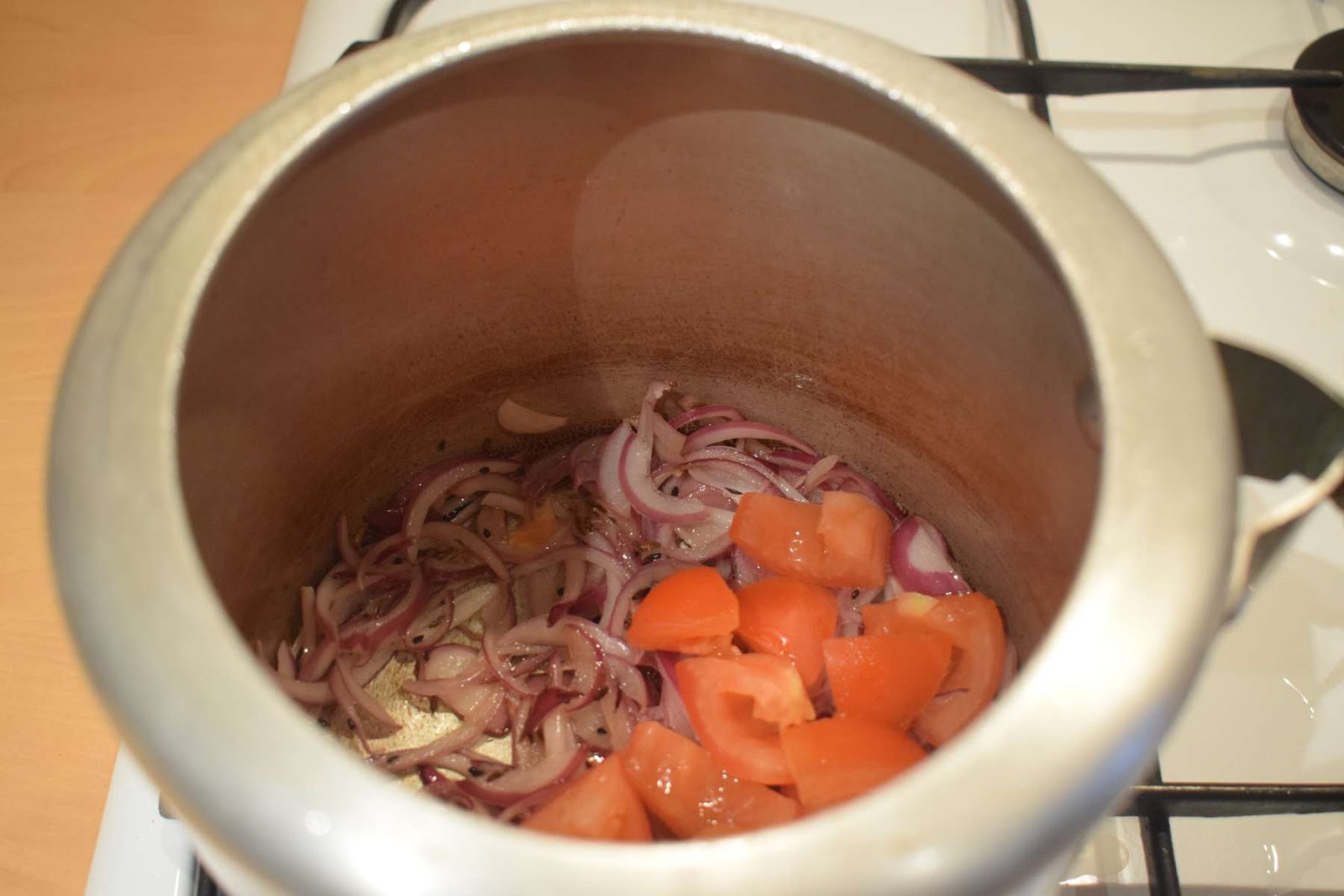 - Add Onion into the pressure cooker and cook till it becomes translucent.