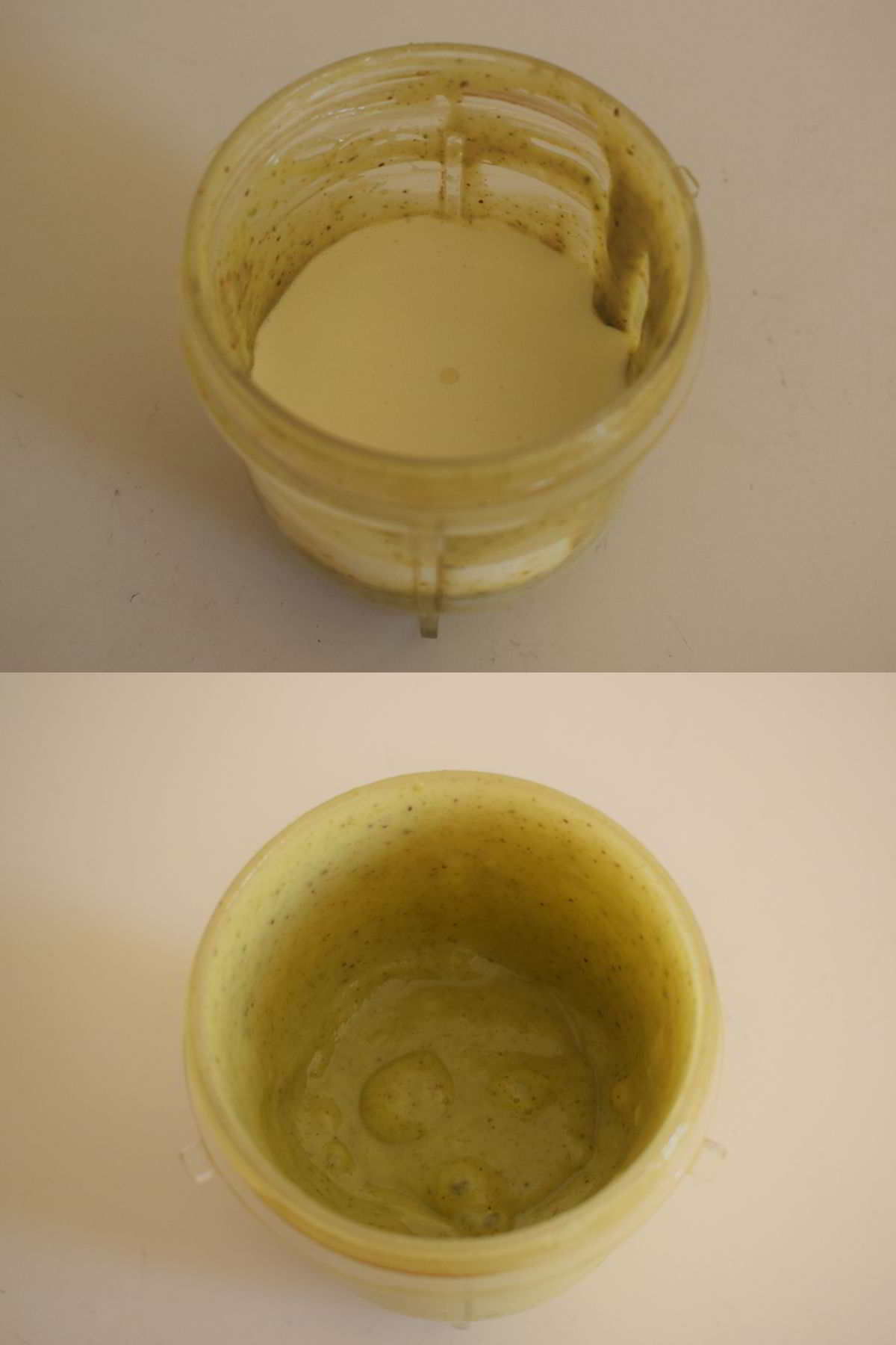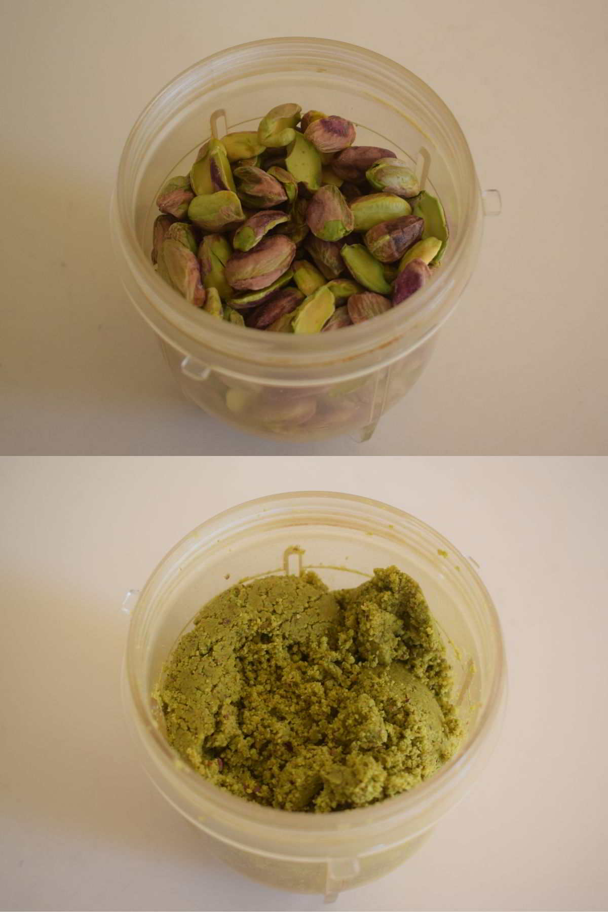 - Add ¼ cup of condensed milk into the jar of the grinder and close the lid. Pulse the rest of the grinded pistachio and condensed milk mixture until it turns into a smooth paste. Keep the paste aside for later use.