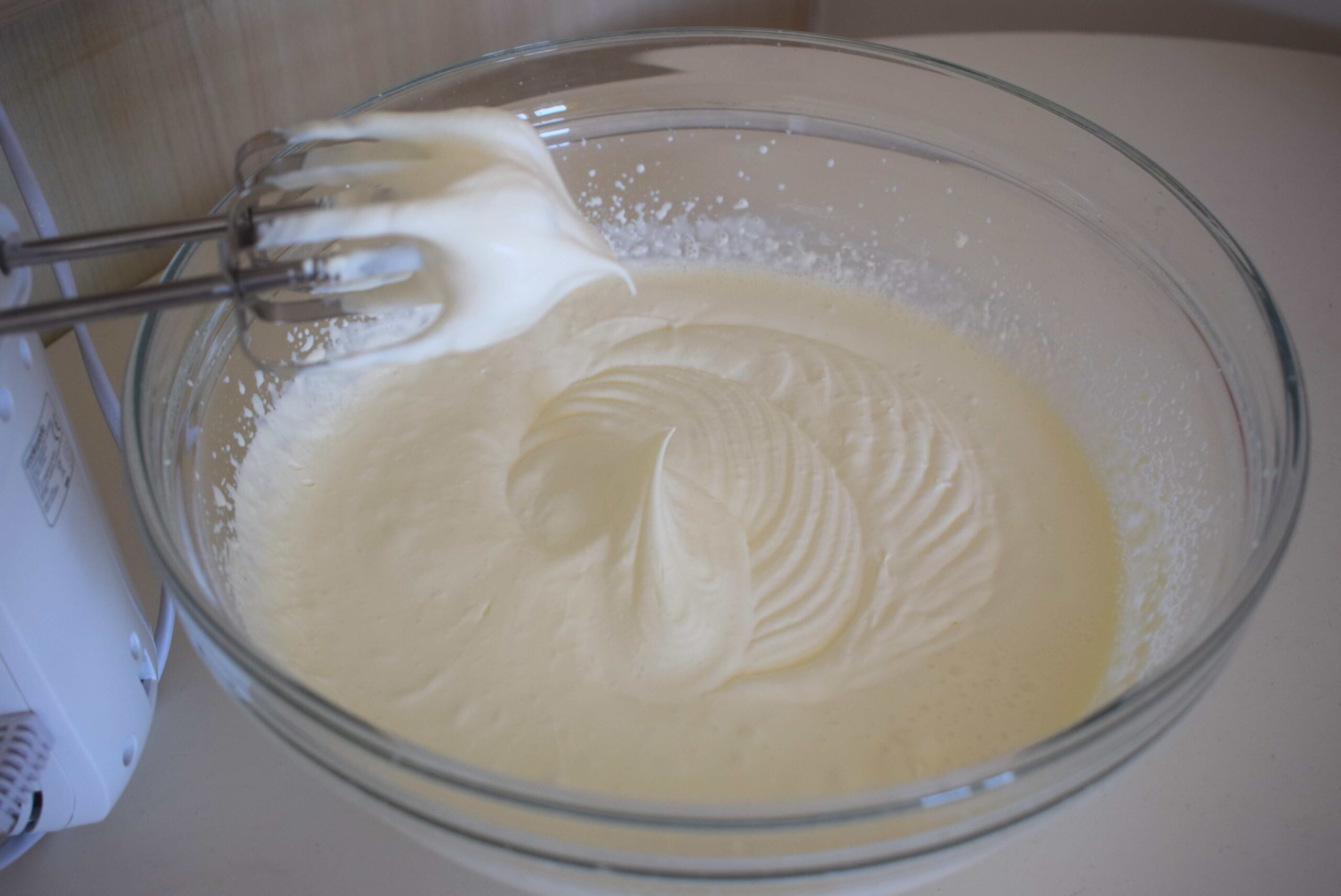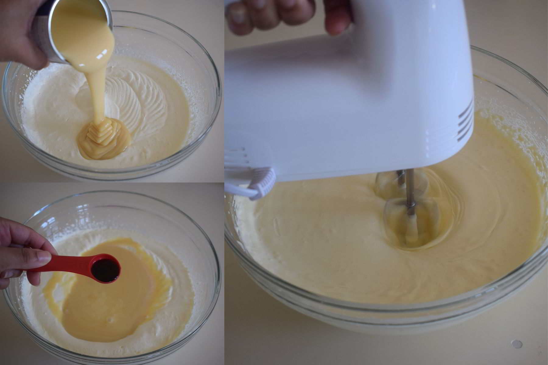 - Add rest of the condensed milk and 1 teaspoon vanilla extract one by one into the whipped cream. Then mix it evenly with a hand mixer in lowest speed. Be delicate at this stage and don’t over mix it.