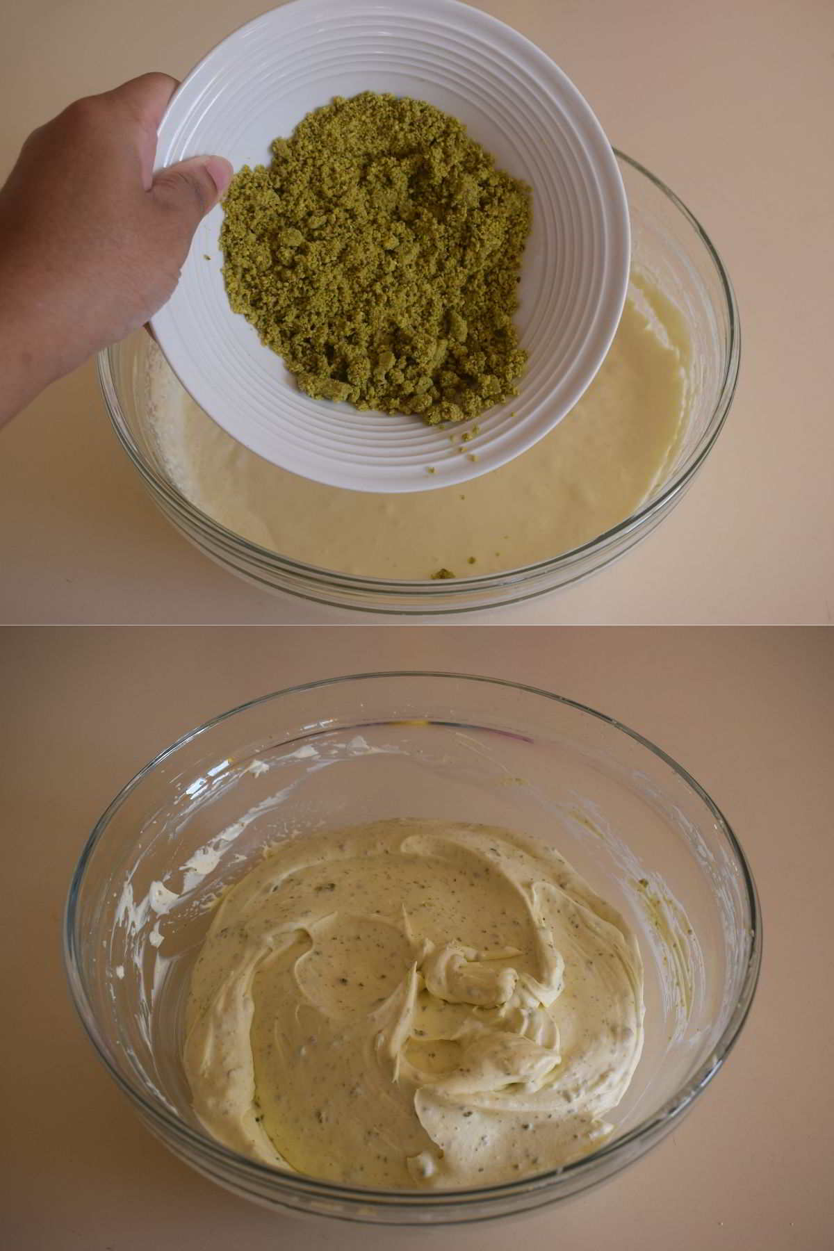- Add the reserved coarsely ground pistachio into the mixture. Then mix it together carefully with the help of a rubber spatula, without deflating the cream.