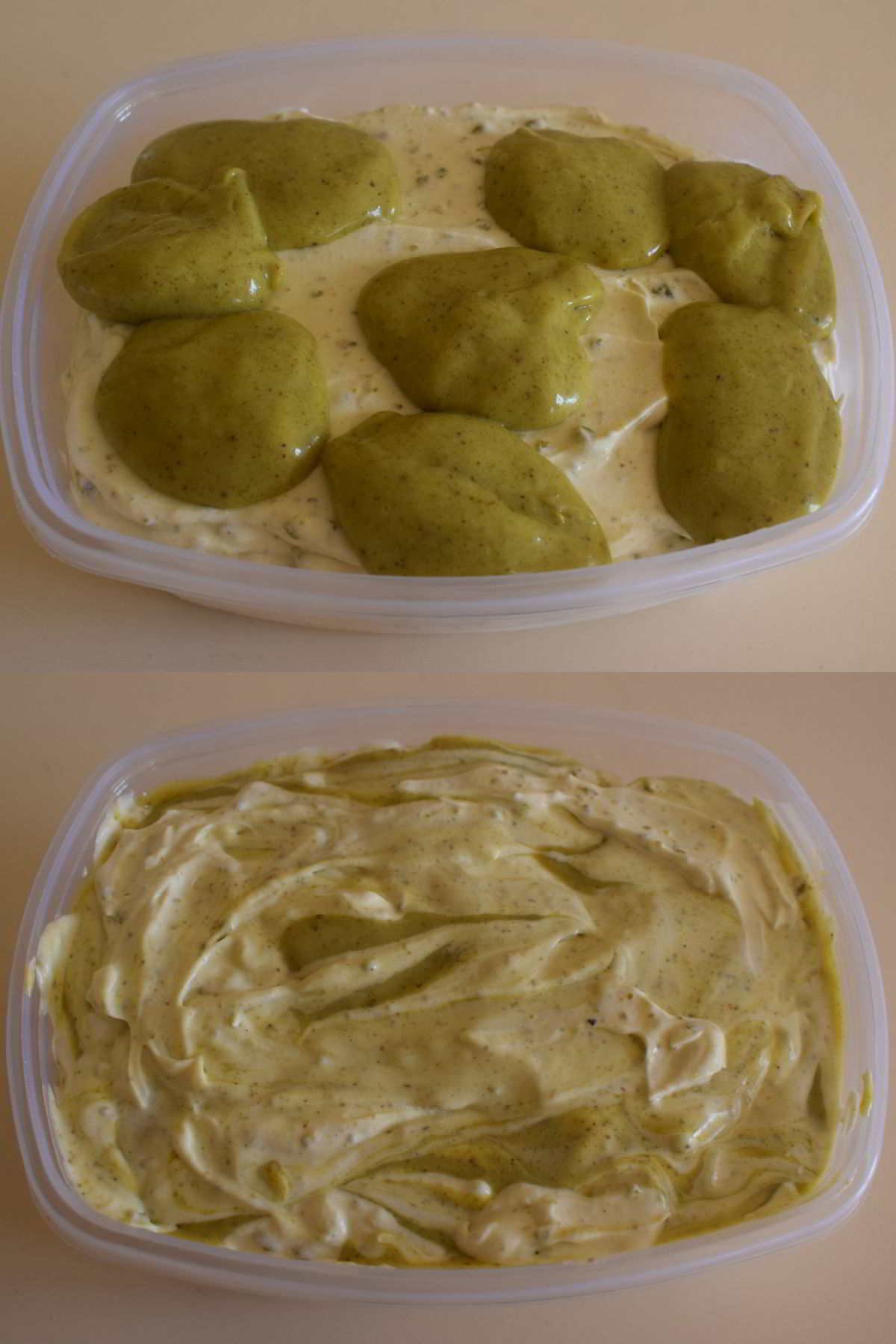 - Now, add the condensed milk pistachio paste (Step 2) on the top of the ice cream mixture and swirl it with the help of a fork or knife.