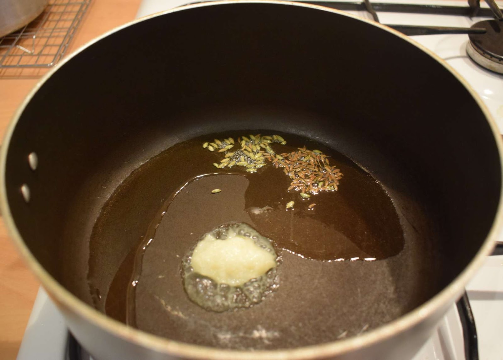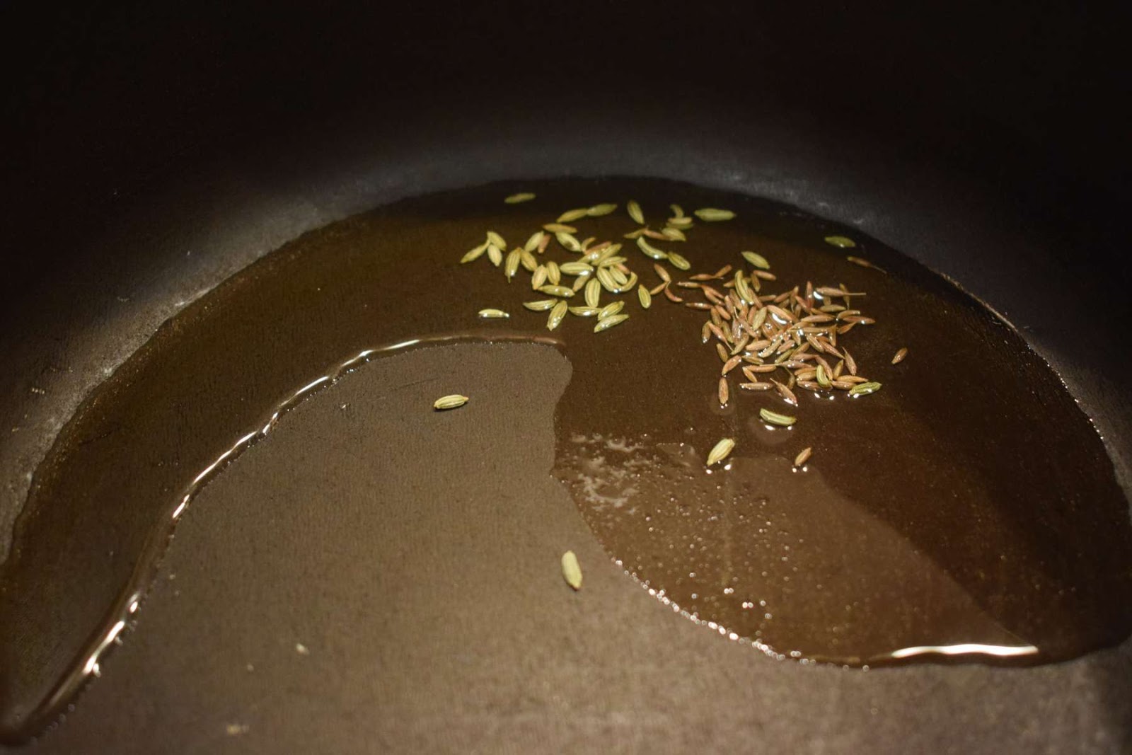 - Once the Oil is hot, add Cumin seeds, Fennel seeds and let them crackle.