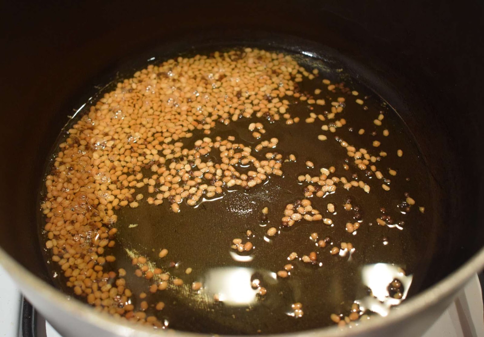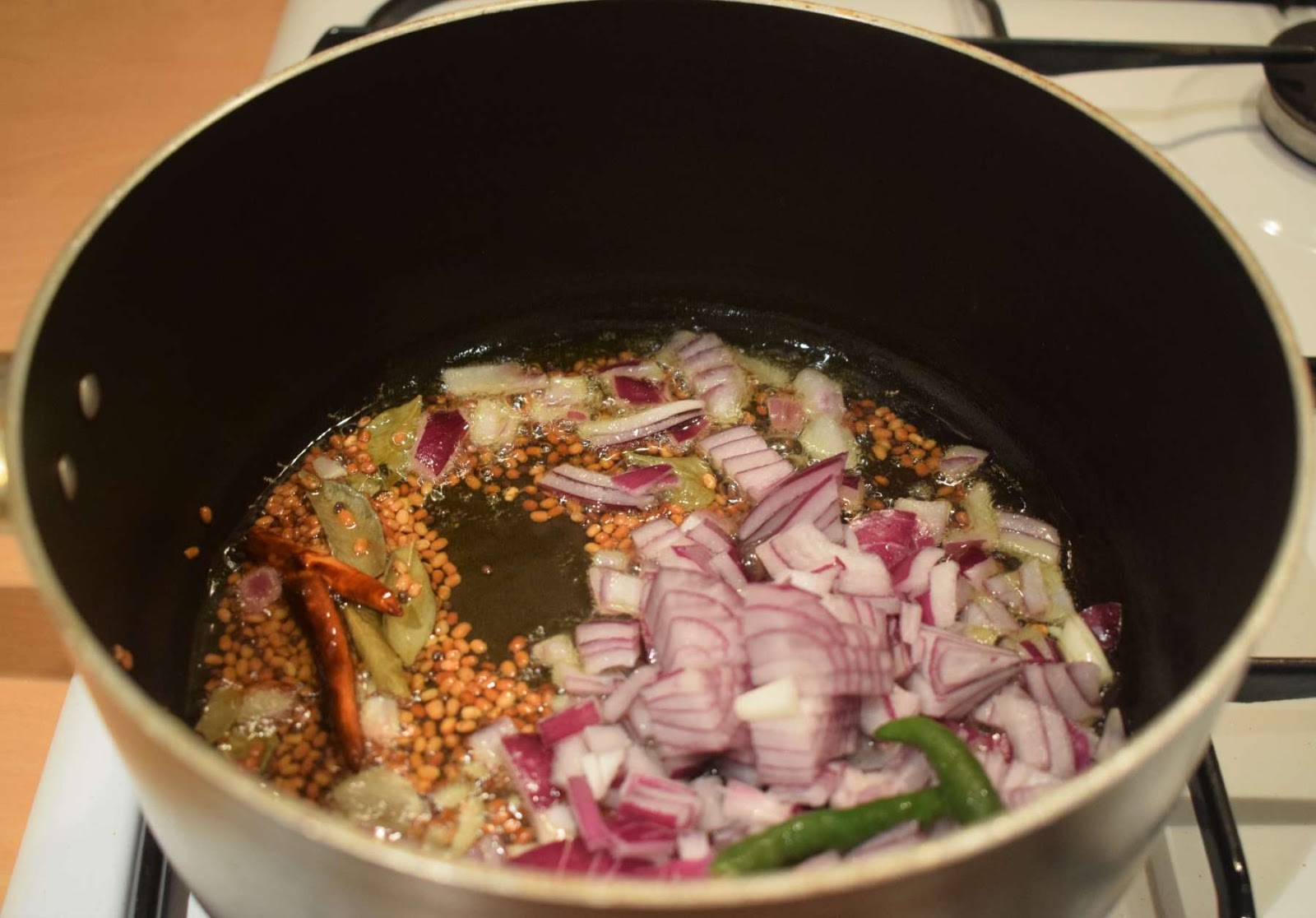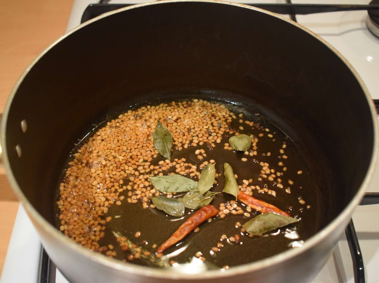 - Add dry red Chillies, Curry leaves and fry them for few seconds.