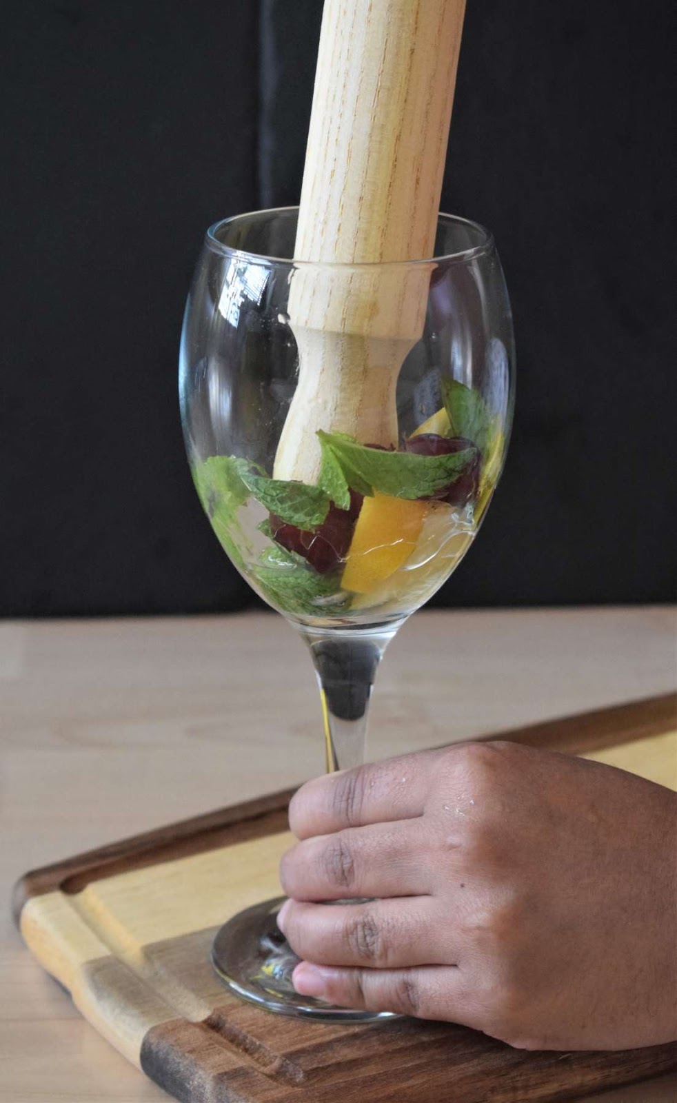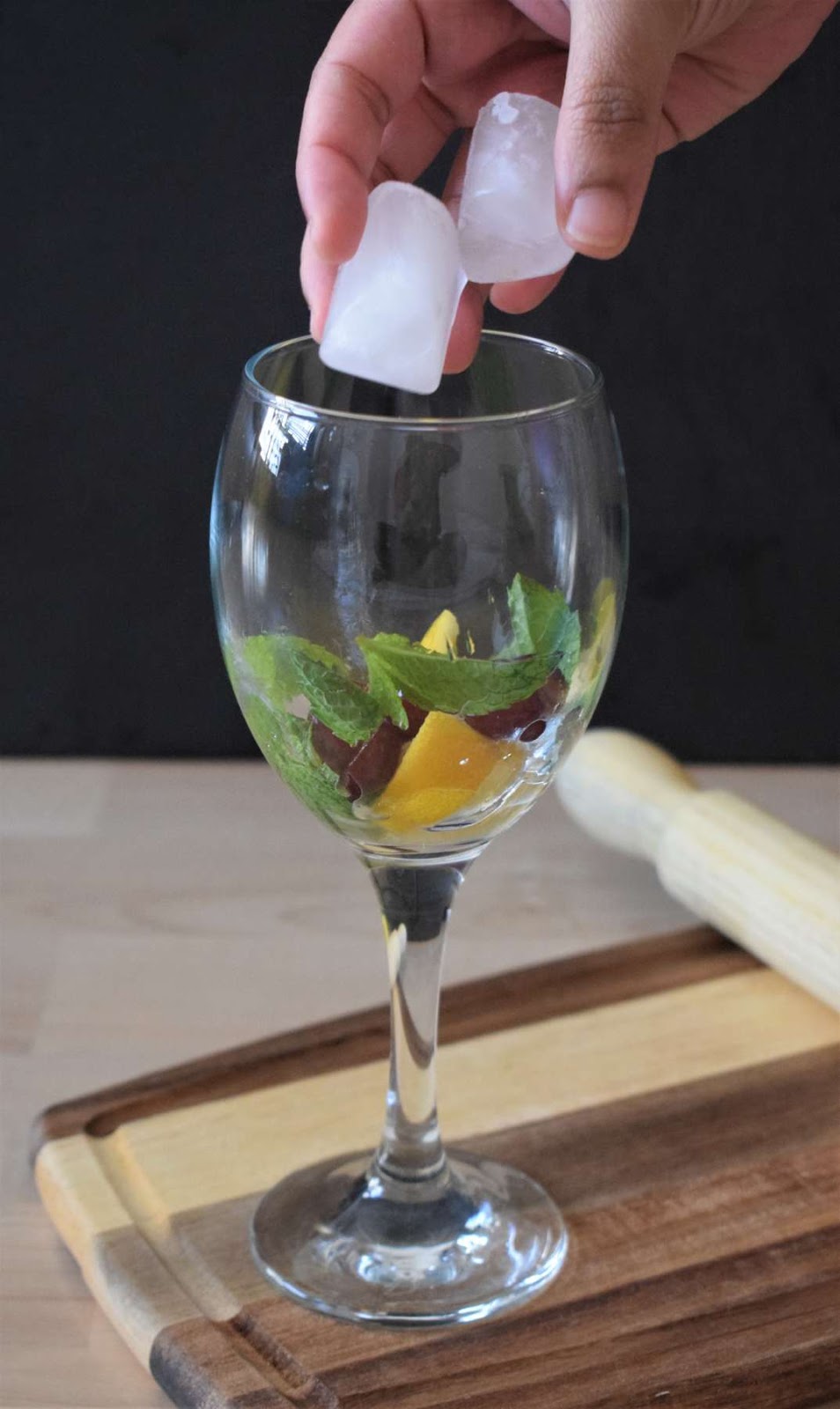 Then I have added the soothing herb, Mint leaves, into the glasses which gives a refreshing flavour to the drink. To enhance the fruity flavour of the drink, I have also added some Red Grapes into the glass.