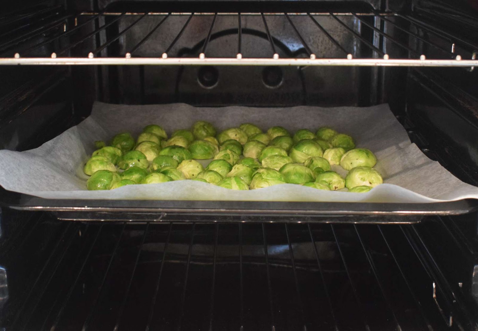 - Spread the tossed Brussels Sprouts on the baking tray (Step 2). Put them in single layer and leave a bit gap between the Brussels Sprouts. Put the cut side down to the baking tray for crispy edges.