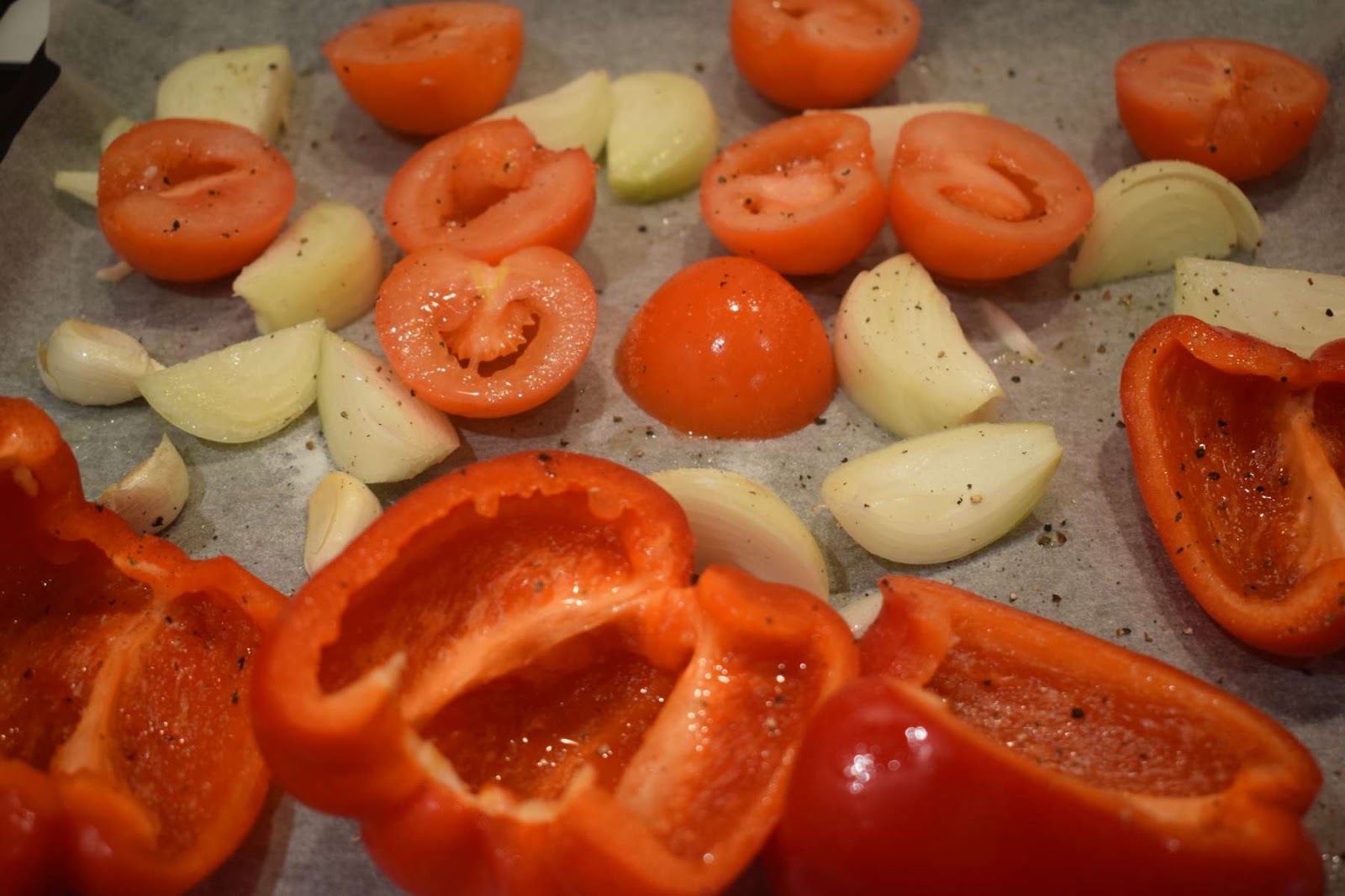 I have oiled all the veggies evenly and seasoned with salt and pepper before putting the tray into the oven. Then I have roasted them in fan oven for 30-35 minutes until the bell peppers skin chars. I have then allowed them to cool down before peeling the skin of tomatoes, bell peppers and garlic cloves.